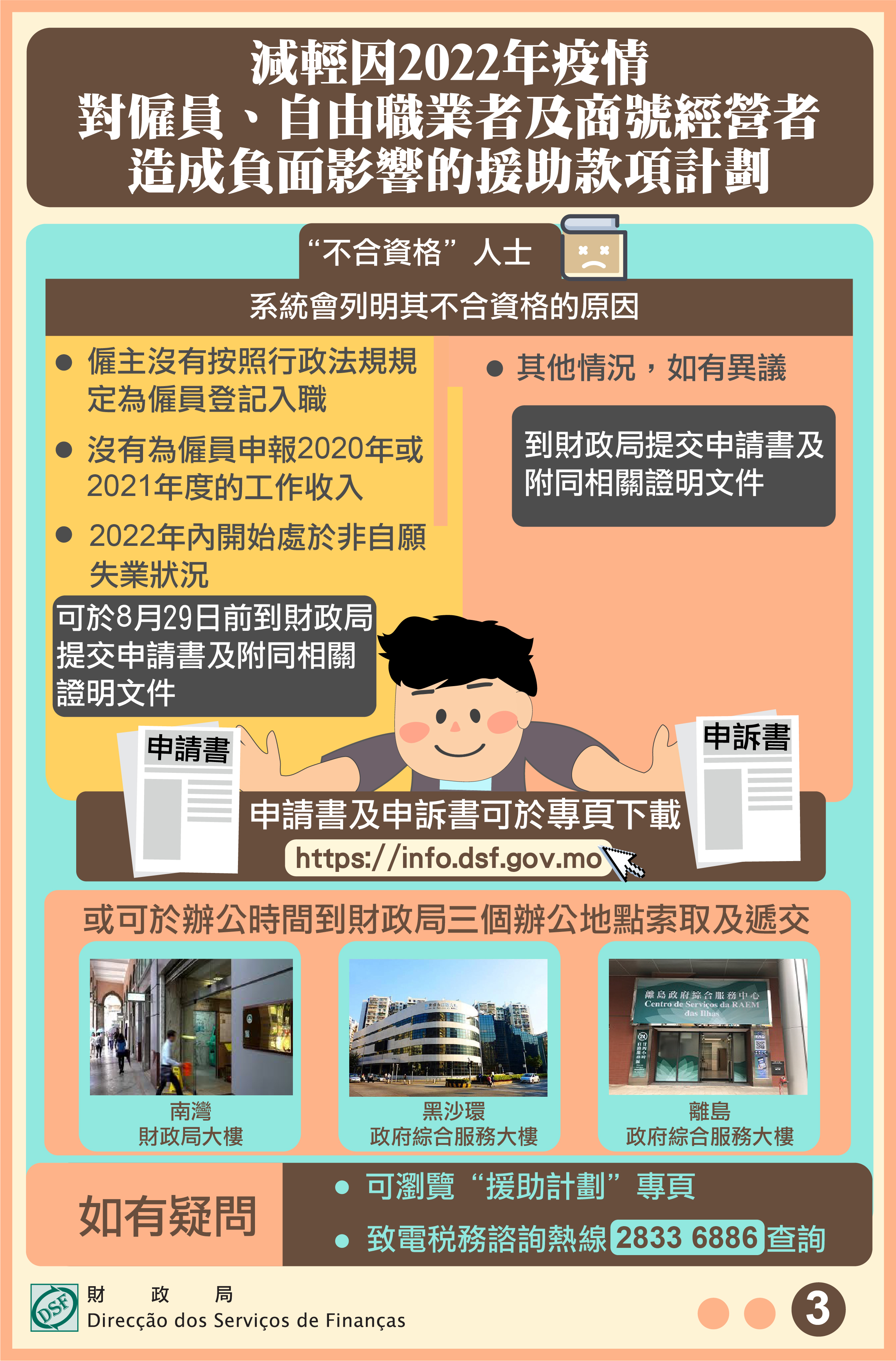 如有疑問,居民可瀏覽援助計劃專頁,又或致電稅務諮詢熱線2833 6886查詢,亦可於辦公時間內親臨南灣財政局大樓、黑沙環政府綜合服務大樓、離島政府綜合服務中心的財政局服務站點,查詢或索取上述申請書及申訴書。
