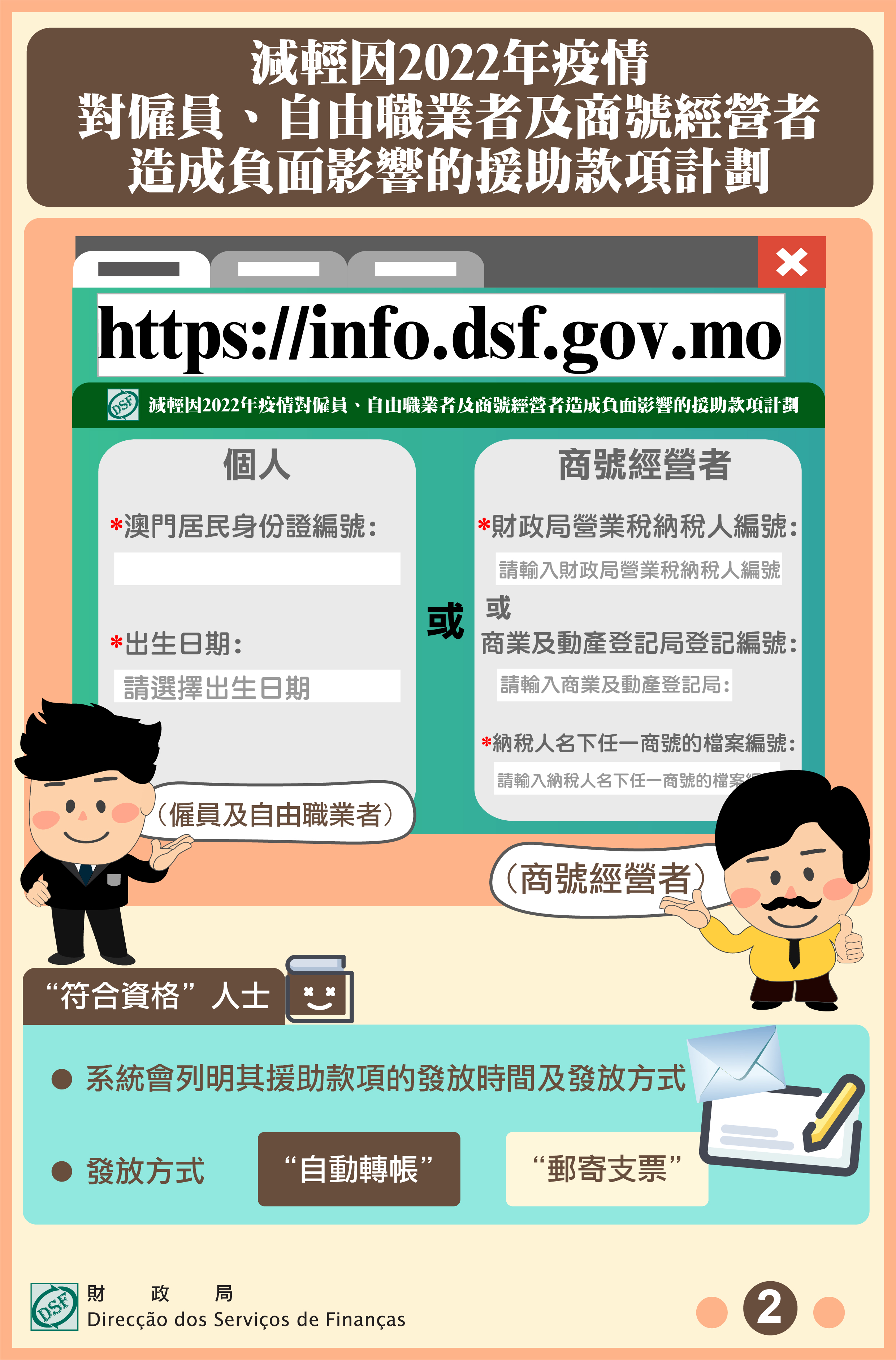 如發放方式顯示為 “郵寄支票”,則未登記銀行轉帳的僱員及特定行業自由職業者,支票會按其在身份證明局登記的地址寄送;商號經營者及屬職業稅第二組納稅人的自由職業者,支票會按其在財政局登記的地址寄送。