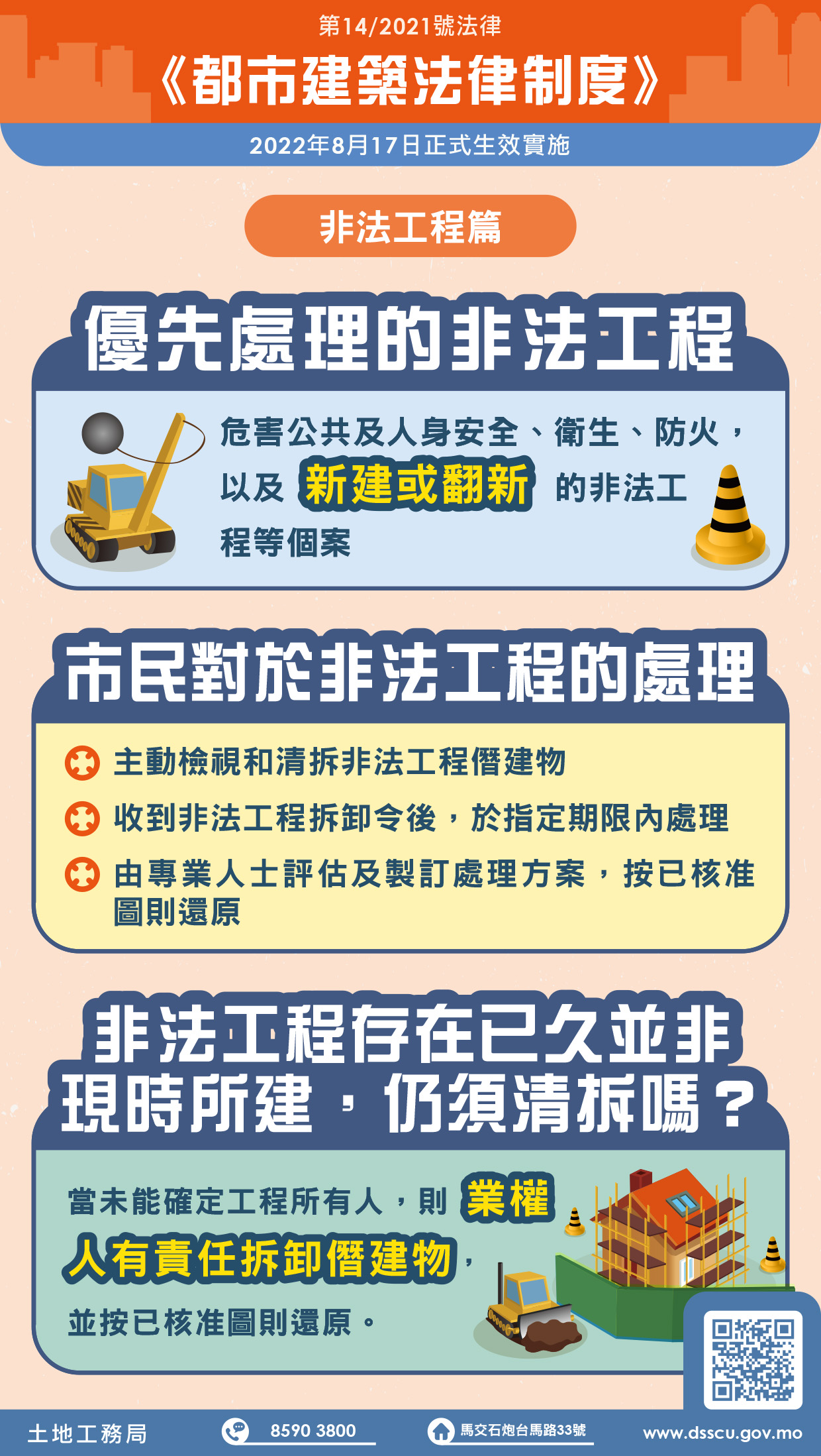第14/2021號法律《都市建築法律制度》將於2022年8月17日起正式實施。針對處理非法工程,法律加大了罰款金額以加強打擊力度。其中,進行非法工程,違法人可被科處罰款,罰款金額自然人由澳門元五千元至一百萬元不等(法人更高至二百萬元);科處罰款不免除違法人拆除有關非法工程,倘違法人不遵守當局發出的拆卸令,尚可被科處罰款,金額由澳門元五千元至五十萬元不等。