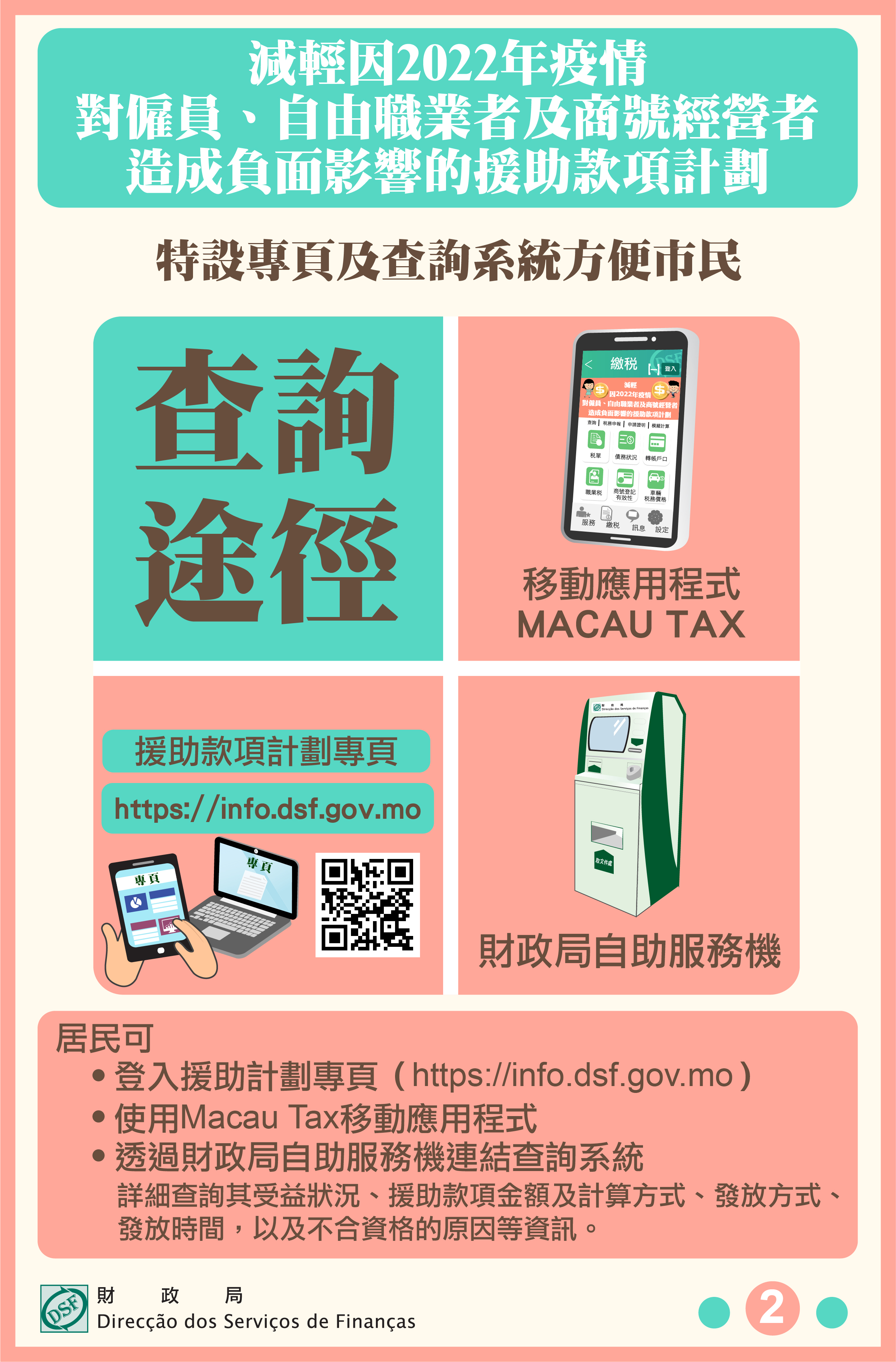 居民可登入援助計劃專頁( https://info.dsf.gov.mo )、使用Macau Tax移動應用程式,又或透過財政局自助服務機連結查詢系統,詳細查詢其受益狀況、援助款項金額及計算方式、發放方式、發放時間,以及不合資格的原因等資訊。