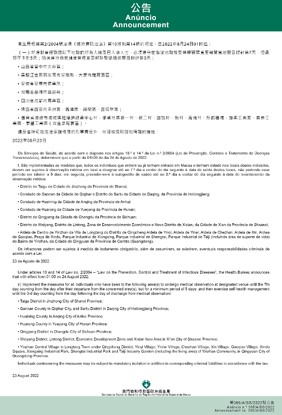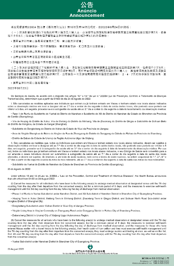 新型冠狀病毒感染應變協調中心(下稱應變協調中心)宣佈,因應內地的疫情變化,衛生局根據第2/2004號法律《傳染病防治法》第10條和第14條的規定,自2022年8月24日凌晨1時起,新增或取消對曾到內地相關區域人士的防疫措施: