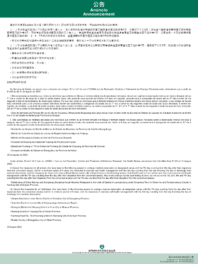 新型冠狀病毒感染應變協調中心(下稱應變協調中心)宣佈,因應內地的疫情變化,衛生局根據第2/2004號法律《傳染病防治法》第10條和第14條的規定,自2022年8月31日凌晨1時起,新增或取消對曾到內地相關區域人士的防疫措施: