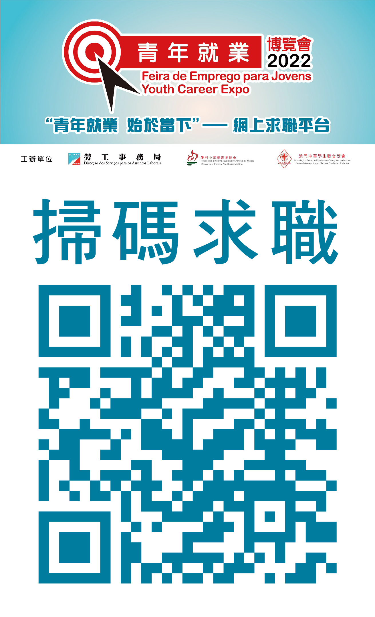 勞工事務局、澳門中華新青年協會及澳門中華學生聯合總會聯合定於本年10月8及9日假澳門威尼斯人會議廳聯合舉辦“青年就業博覽會2022”(下稱活動),主題為“青年就業,始於當下”。為協助求職青年盡快投身就業市場,今年活動以大型招聘會形式舉行,即日起開通網上求職平台。