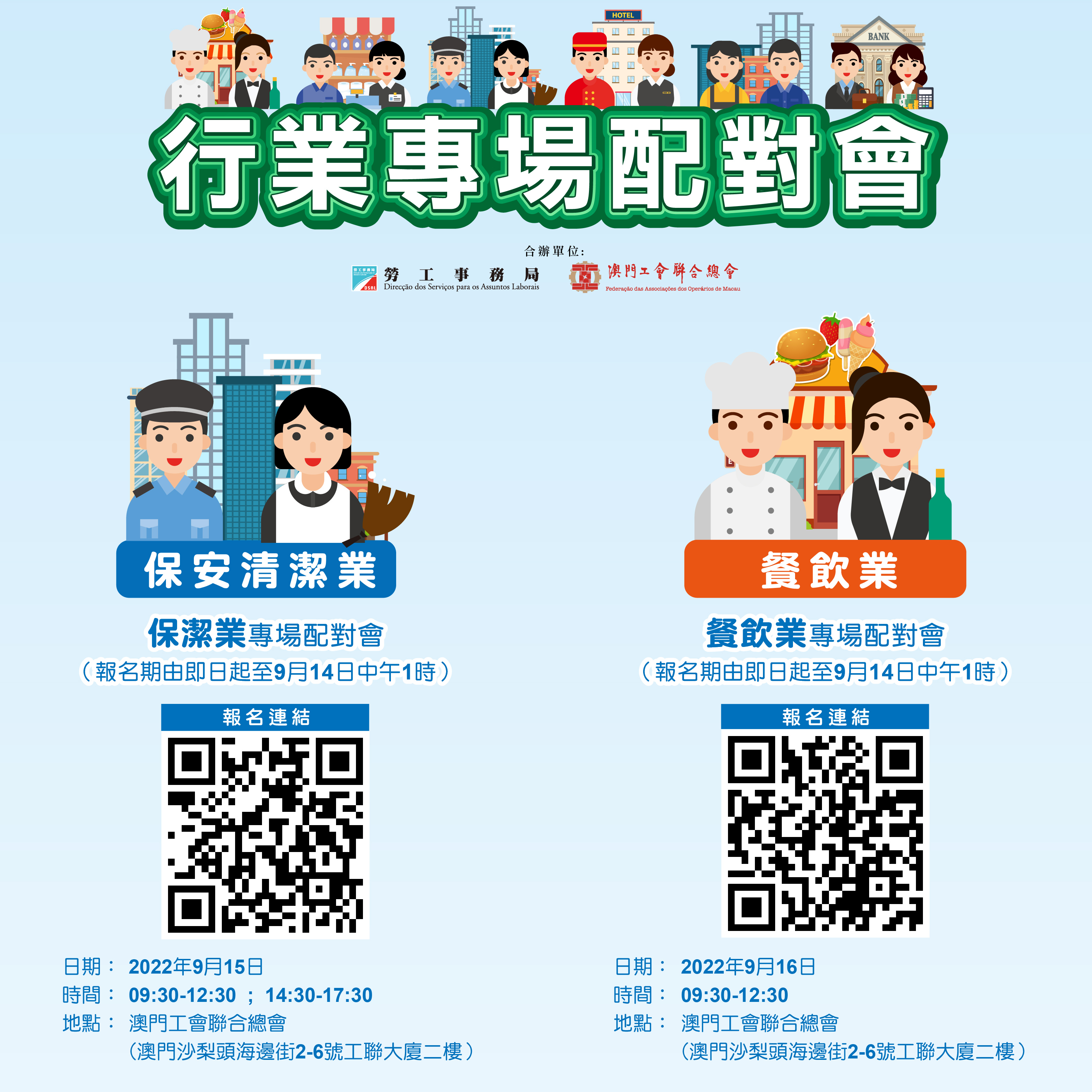 9月15日“保潔業專場配對會”(報名期由即日起至9月14日中午1時)報名連結:https://www.dsal.gov.mo/link/event/20220915.htm