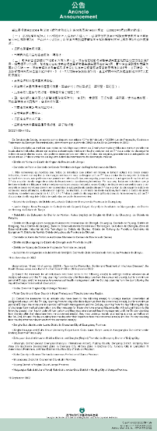 新型冠狀病毒感染應變協調中心(下稱應變協調中心)宣佈,因應內地的疫情變化,衛生局根據第2/2004號法律《傳染病防治法》第10條和第14條的規定,自2022年9月20日凌晨1時起,新增或取消對曾到內地相關區域人士的防疫措施: