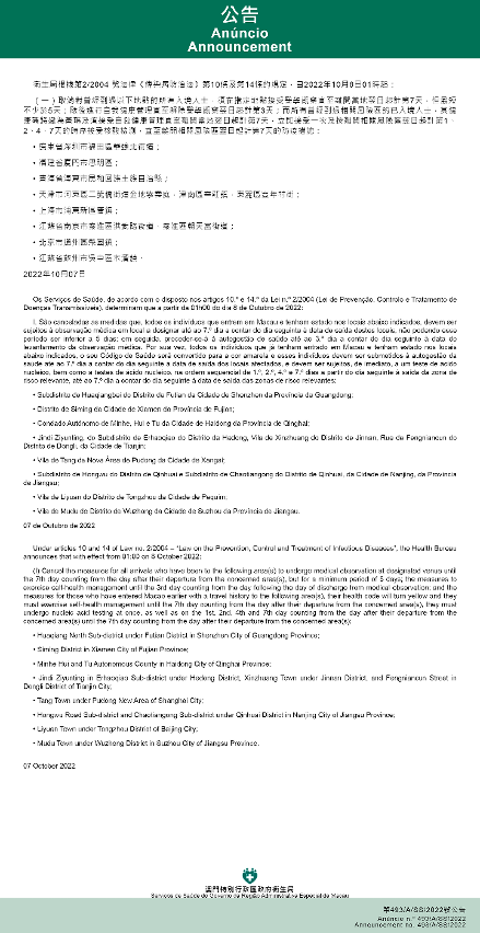 新型冠狀病毒感染應變協調中心(下稱應變協調中心)宣佈,因應內地的疫情變化,衛生局根據第2/2004號法律《傳染病防治法》第10條和第14條的規定,自2022年10月8日凌晨1時起,新增或取消對曾到內地相關區域人士的防疫措施: