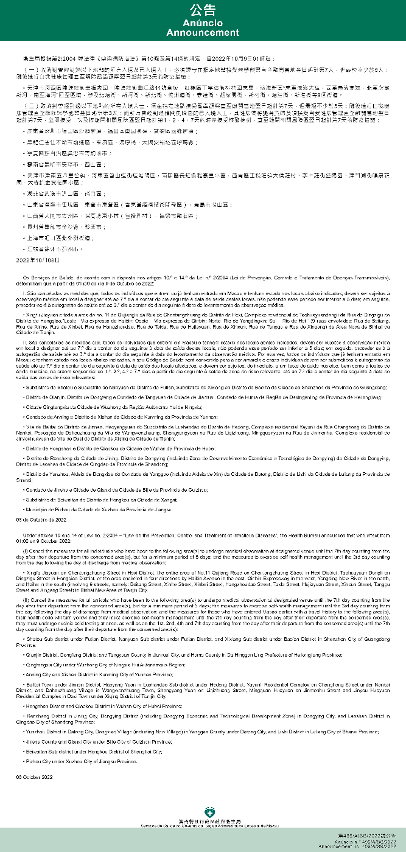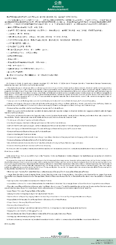 新型冠狀病毒感染應變協調中心(下稱應變協調中心)宣佈,因應內地的疫情變化,衛生局根據第2/2004號法律《傳染病防治法》第10條和第14條的規定,自2022年10月9日凌晨1時起,新增或取消對曾到內地相關區域人士的防疫措施: