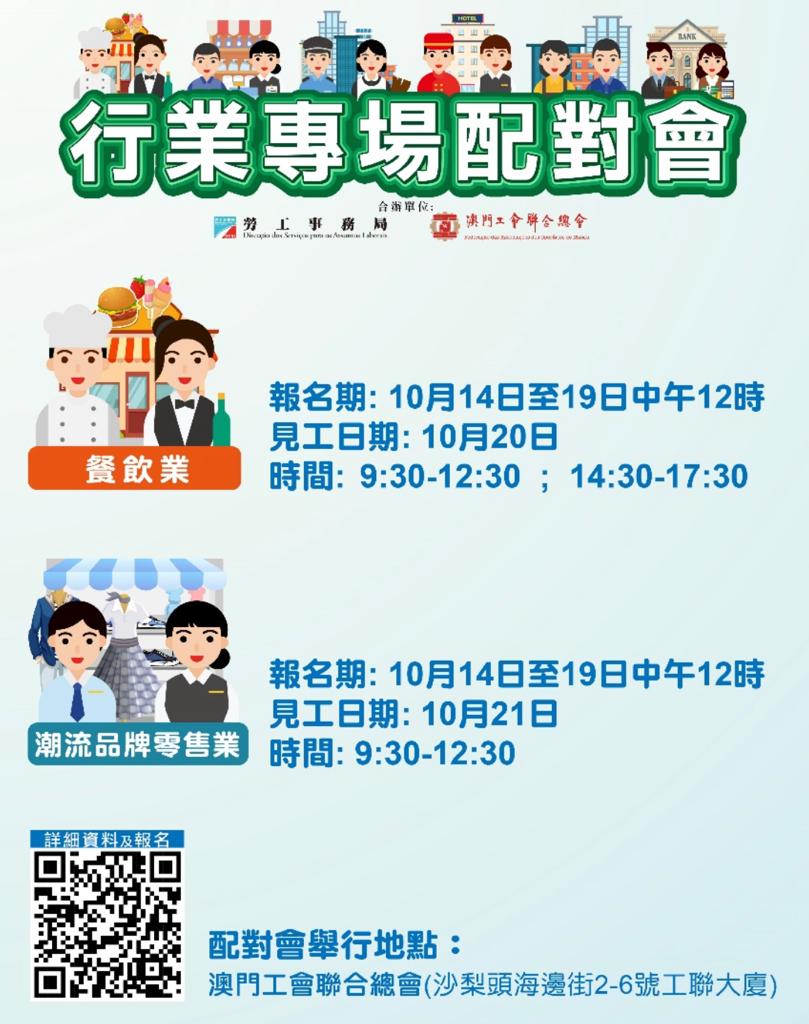 為協助有求職需求的居民盡快就業,勞工事務局持續與澳門工會聯合總會合作,將於10月20及21日舉辦餐飲業及潮流品牌零售行業3場專場配對會,提供136個空缺,今(14)日起至10月19日可登入勞工局行業專場配對會專頁報名。