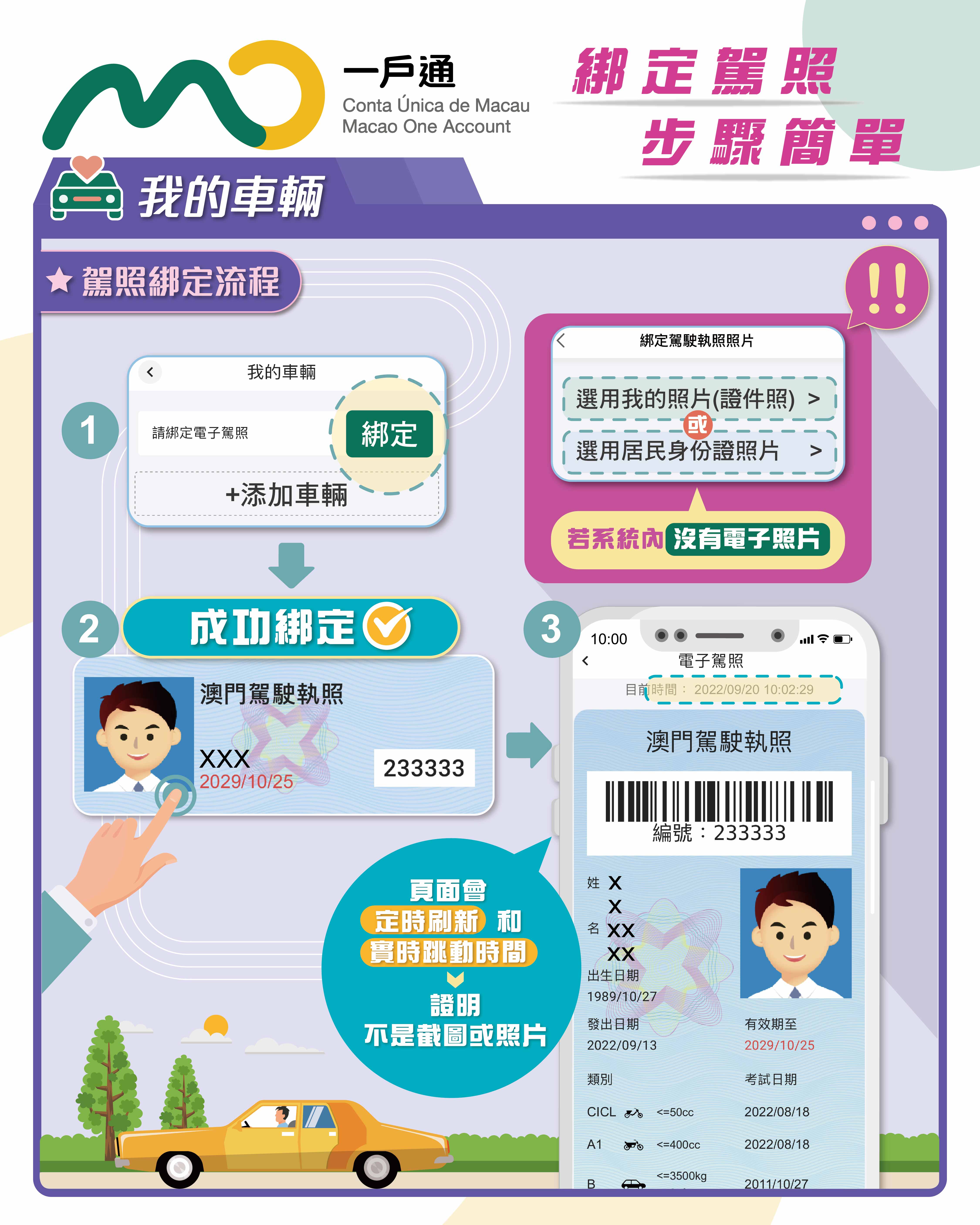 特別提醒駕駛者,特區政府並無取消任何紙本文件。駕駛者可按個人意願,以紙本或電子方式出示駕照、車保。倘以電子方式出示,必須透過統一電子平台(即“一戶通”)作展示,只出示電子影像(如手機截圖、相片等)並不符合法律要求。
