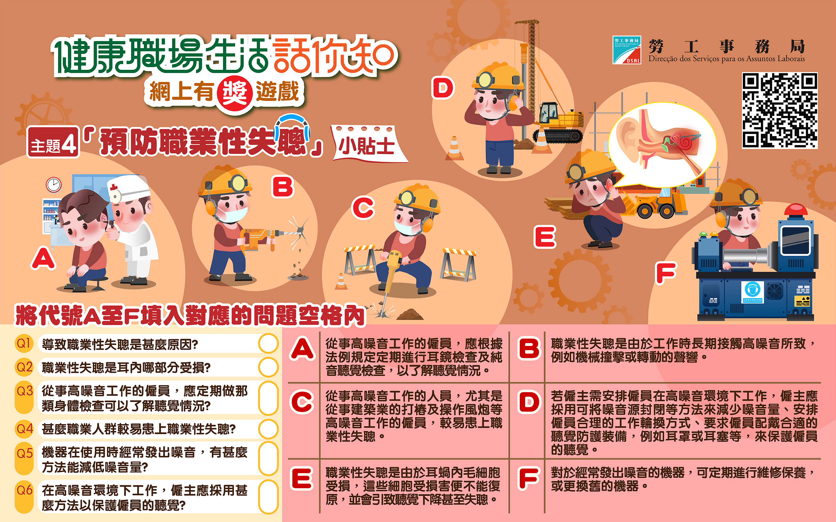 勞工局希望透過問答遊戲,讓公眾認識及預防職業性失聰問題,如果長時間暴露於噪音環境下工作,有可能導致聽覺下降,甚至有職業性失聰的風險。參加者將認識工作場所噪音對聽覺的影響,以及了解聽覺保護的預防措施。