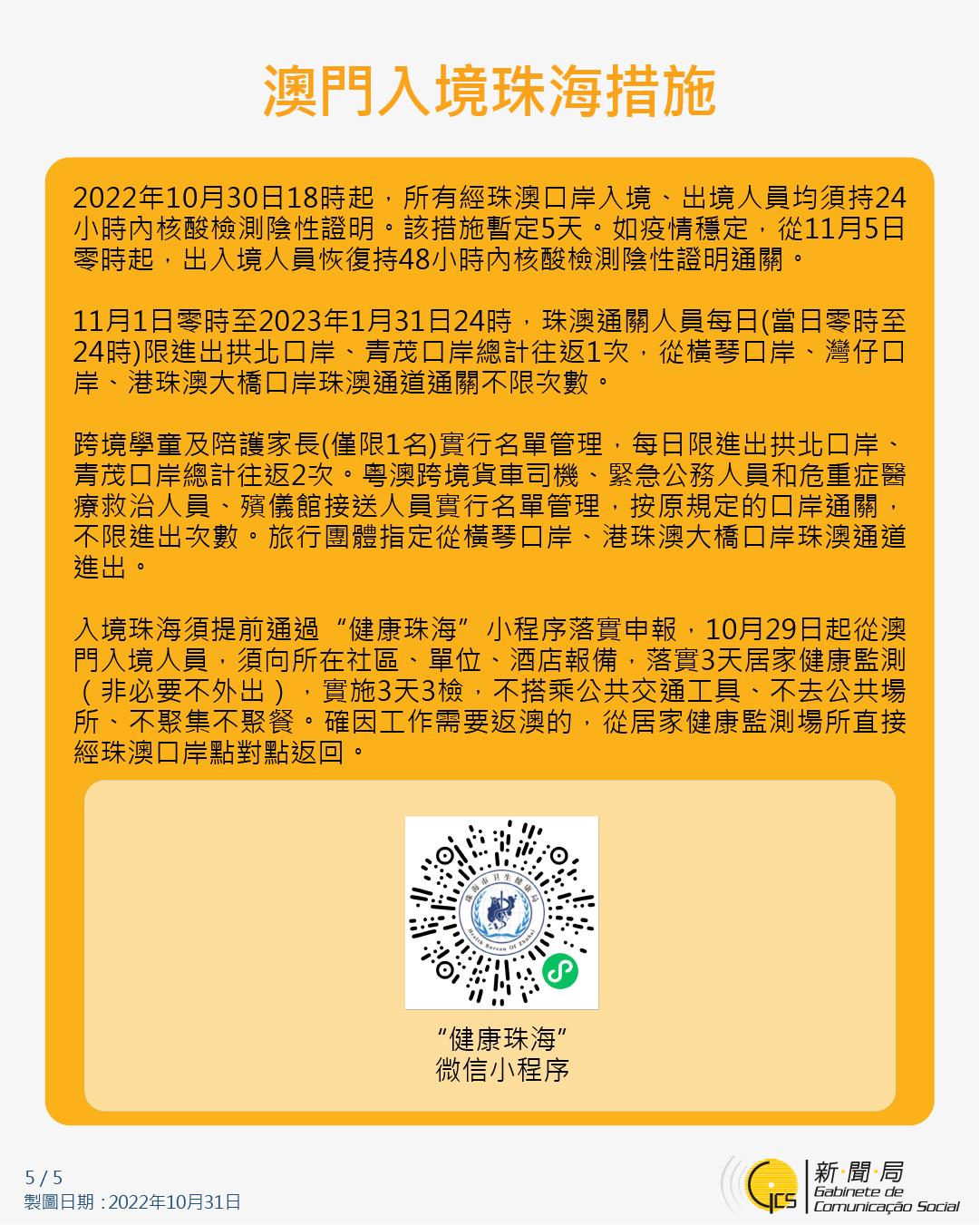 【圖文包】最新入境澳門的防疫措施 (2022/10/31)