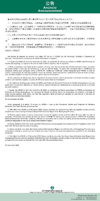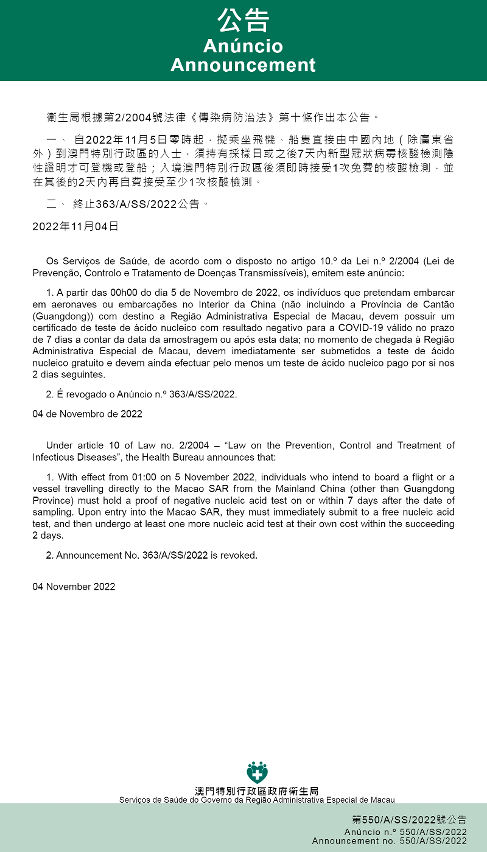 新型冠狀病毒感染應變協調中心宣佈,經考慮本地的實際需要及評估相關地區疫情風險後,衛生局根據傳染病防治法第十條第二款第(二)項及第166/2022號行政長官批示第一款的規定作出第544/A/SS/2022號公告、549/A/SS/2022號公告及終止第296/A/SS/2022號公告。自2022年11月5日零時起,由廣東省入境澳門特別行政區的人士,核酸檢測陰性證明要求如下: