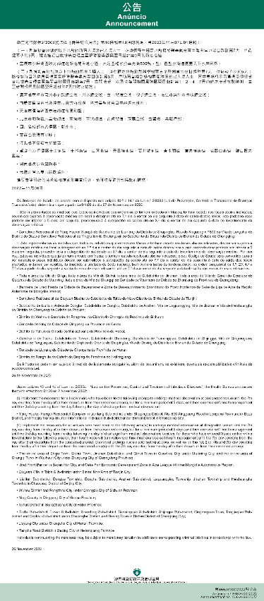 新型冠狀病毒感染應變協調中心(下稱應變協調中心)宣佈,因應內地的疫情變化,衛生局根據第2/2004號法律《傳染病防治法》第10條和第14條的規定,自2022年11月7日凌晨1時起,新增或取消對曾到內地相關區域人士的防疫措施: