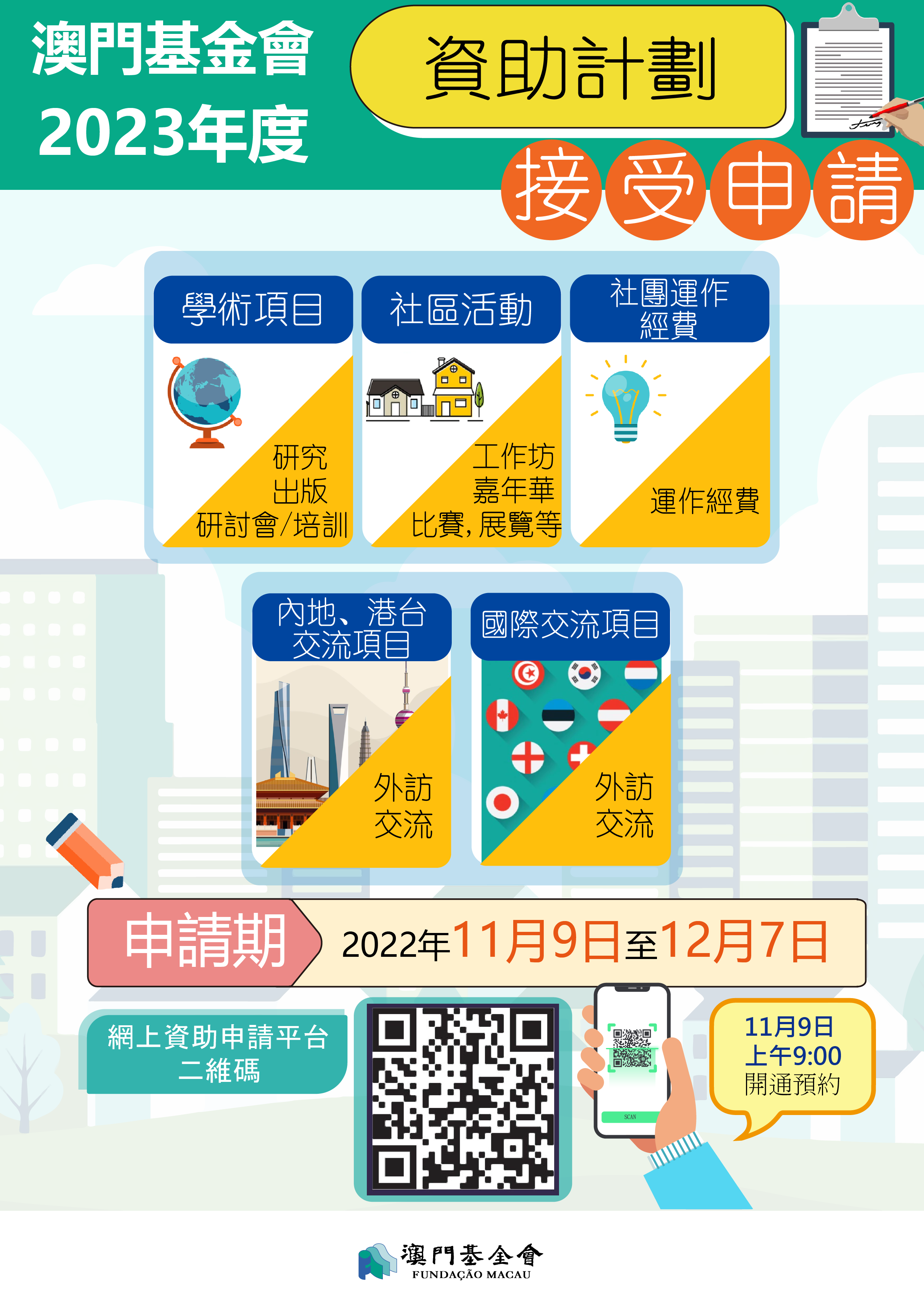 澳門基金會2023年度的“學術項目”、“社區活動”、“內地、港台交流”、“國際交流項目”及“社團運作經費”資助計劃將於本年11月9日至12月7日期間接受申請。基於歸口管理的原則,澳基會由2023年起不設“文化項目”資助計劃(包括曲藝),相關申請及資助由文化發展基金受理。