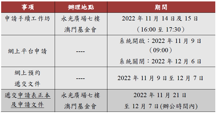 申請者須先在澳基會網上資助申請平台提交申請,再預約遞交文件正本。網上申請平台將於11月9日上午9時正開啟,並於12月6日關閉,有意申請者請先辦理申請網上平台帳戶或檢視已有帳戶是否仍然有效。在網上申請平台提交申請後,申請者可預約於11月21日至12月7日的辦公時間內遞交申請文件正本,逾期提交的申請將不會受理。各資助計劃的章程已上載澳門基金會網頁,請瀏覽https://www.fmac.org.mo/sponsorship/。