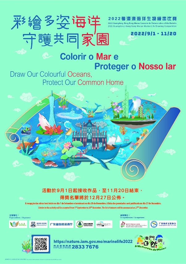 現誠邀各位市民踴躍參與“彩繪多姿海洋,守護共同家園-2022粵港澳海洋生物繪畫比賽”。詳情可瀏覽活動專題網站 https://nature.iam.gov.mo/marinelife2022/,或致電市民服務熱線28337676查詢。