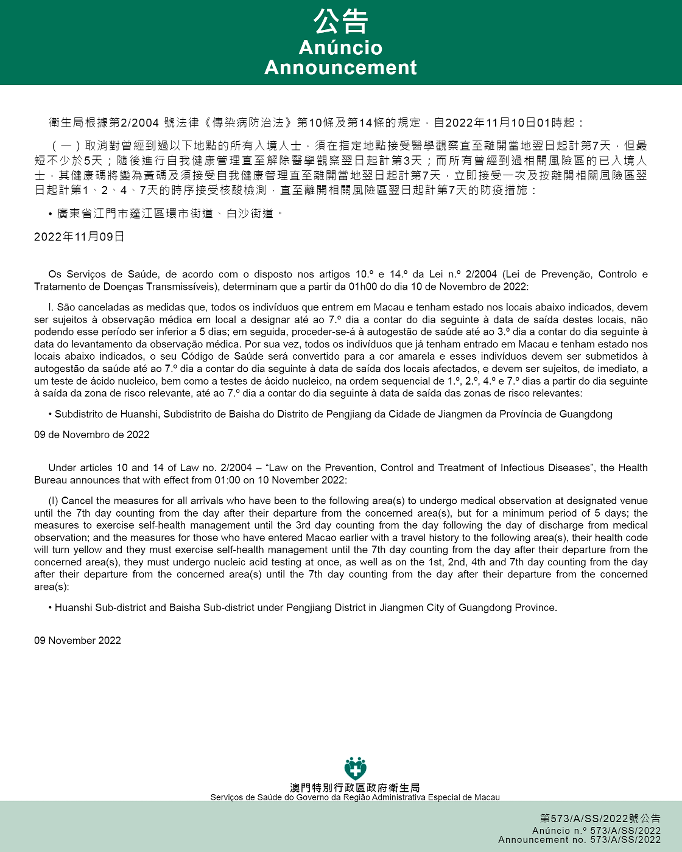 新型冠狀病毒感染應變協調中心(下稱應變協調中心)宣佈,因應內地的疫情變化,衛生局根據第2/2004號法律《傳染病防治法》第10條和第14條的規定,自2022年11月10日凌晨1時起,新增或取消對曾到內地相關區域人士的防疫措施: