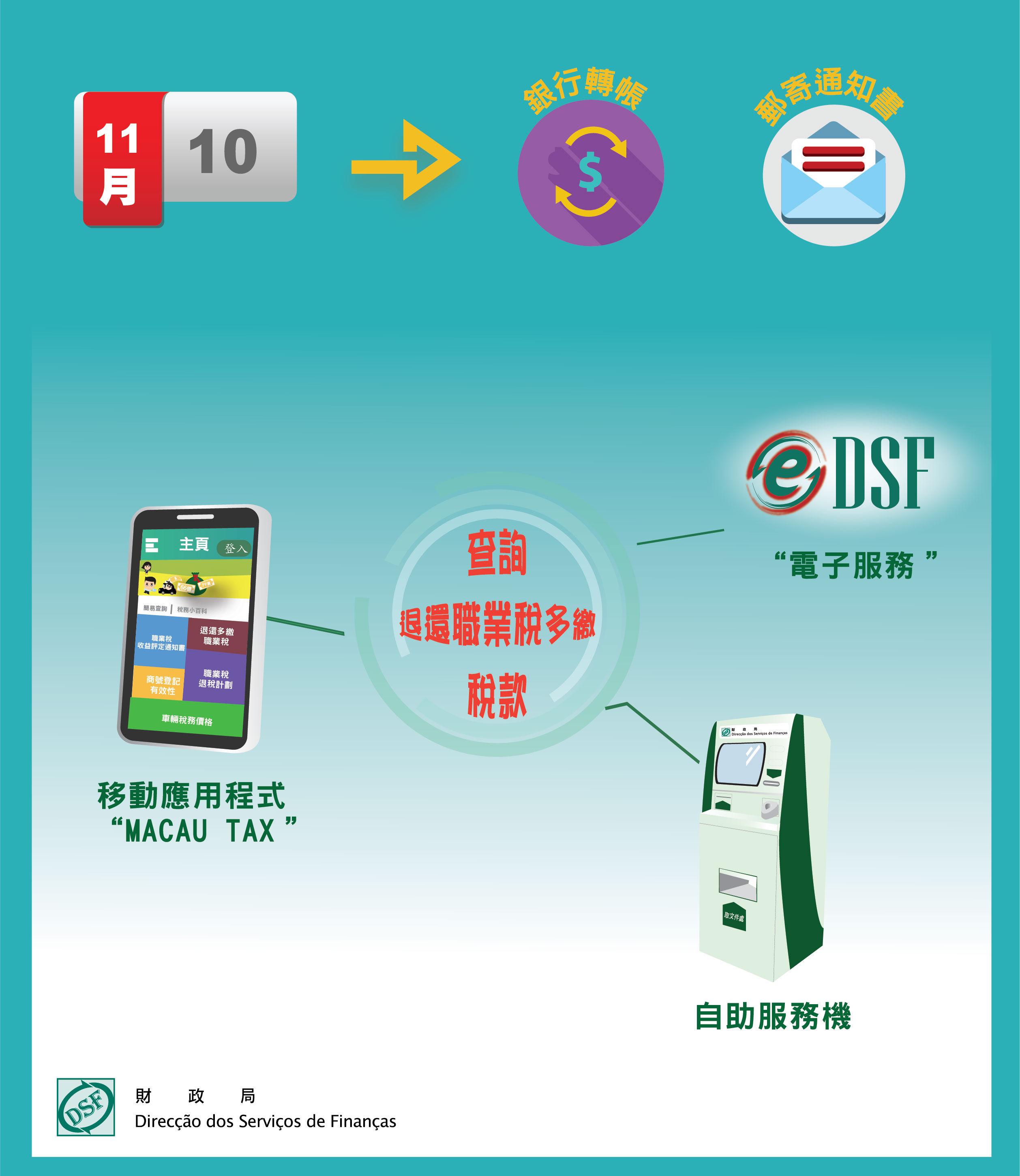 財政局提醒有多繳2021年度職業稅納稅人可透過財政局電子方式,包括:財政局「電子服務」系統、移動應用程式「澳門稅務資訊Macau Tax」,以及自助服務機,直接查閱其本人之職業稅退稅資料。