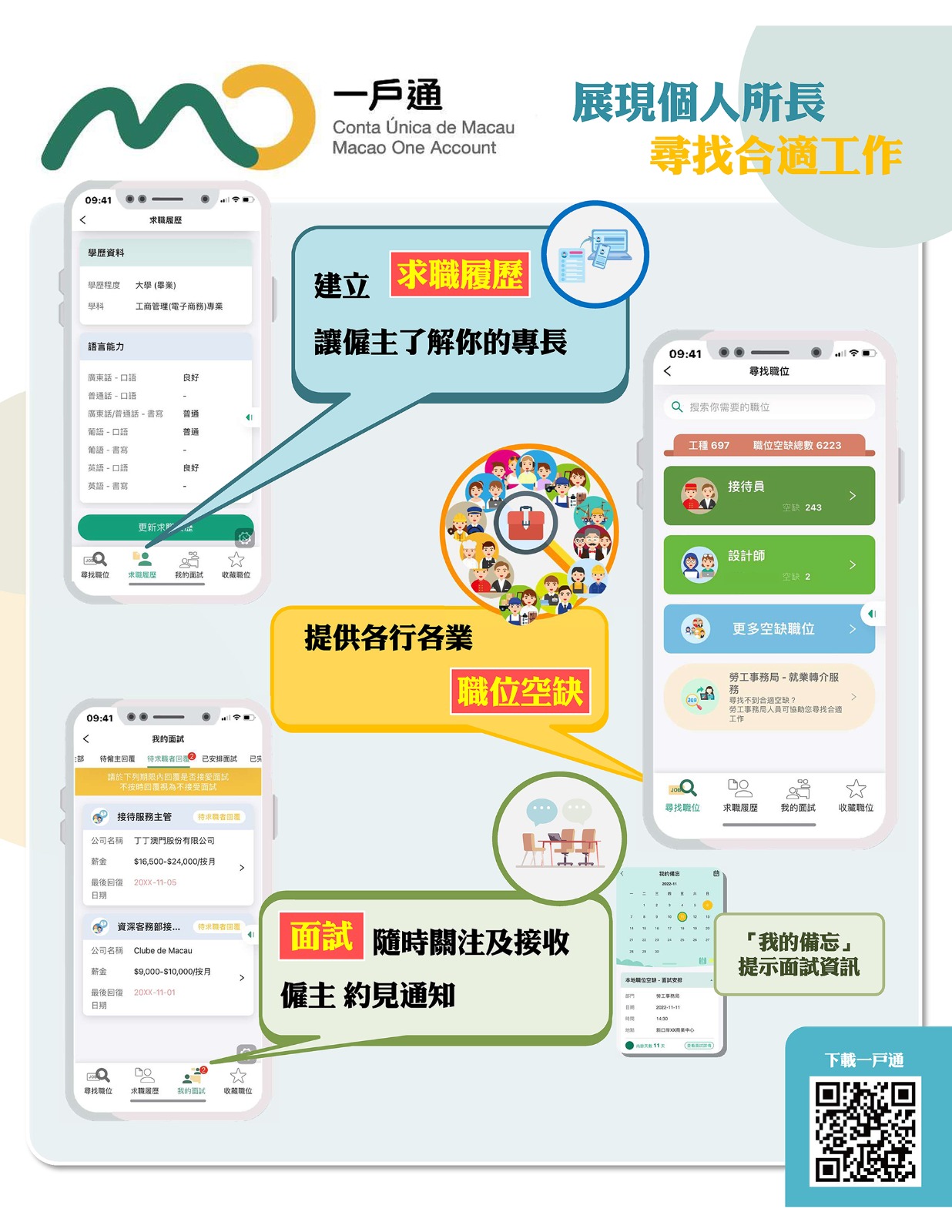 為讓居民更便捷地在“本地職位空缺”窗口應徵工作,是次優化主要新增“求職履歷”、“我的面試”、“收藏職位”等功能。求職者可透過“求職履歷”功能隨時更新個人資料,亦可透過“我的面試”將面試安排自動加至“我的備忘”,屆時可收到面試日期的提示,讓市民做好面試準備。