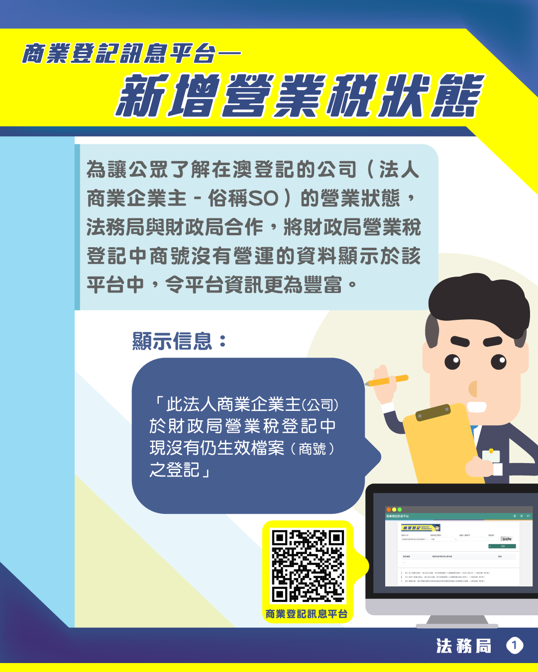 在商業登記方面,法務局於2021年推出商業登記訊息平台,讓有需要人士透過該平台獲取本澳商業企業主(包括自然人商業企業主及法人商業企業主),以及企業的基本登記訊息,如公司的登記編號、商業名稱、住所、所營事業、資本額、行政管理機關成員及其簽名方式等。為使該平台的資訊更為豐富,法務局與財政局合作,於今年9月26日起,於該平台顯示財政局營業稅登記中商號沒有營運的資料,讓公眾了解在澳登記的公司的營業狀態。商業登記訊息平台的網址為:https://eservice.dsaj.gov.mo/dsajservice9/commercial-platform/index.xhtml。