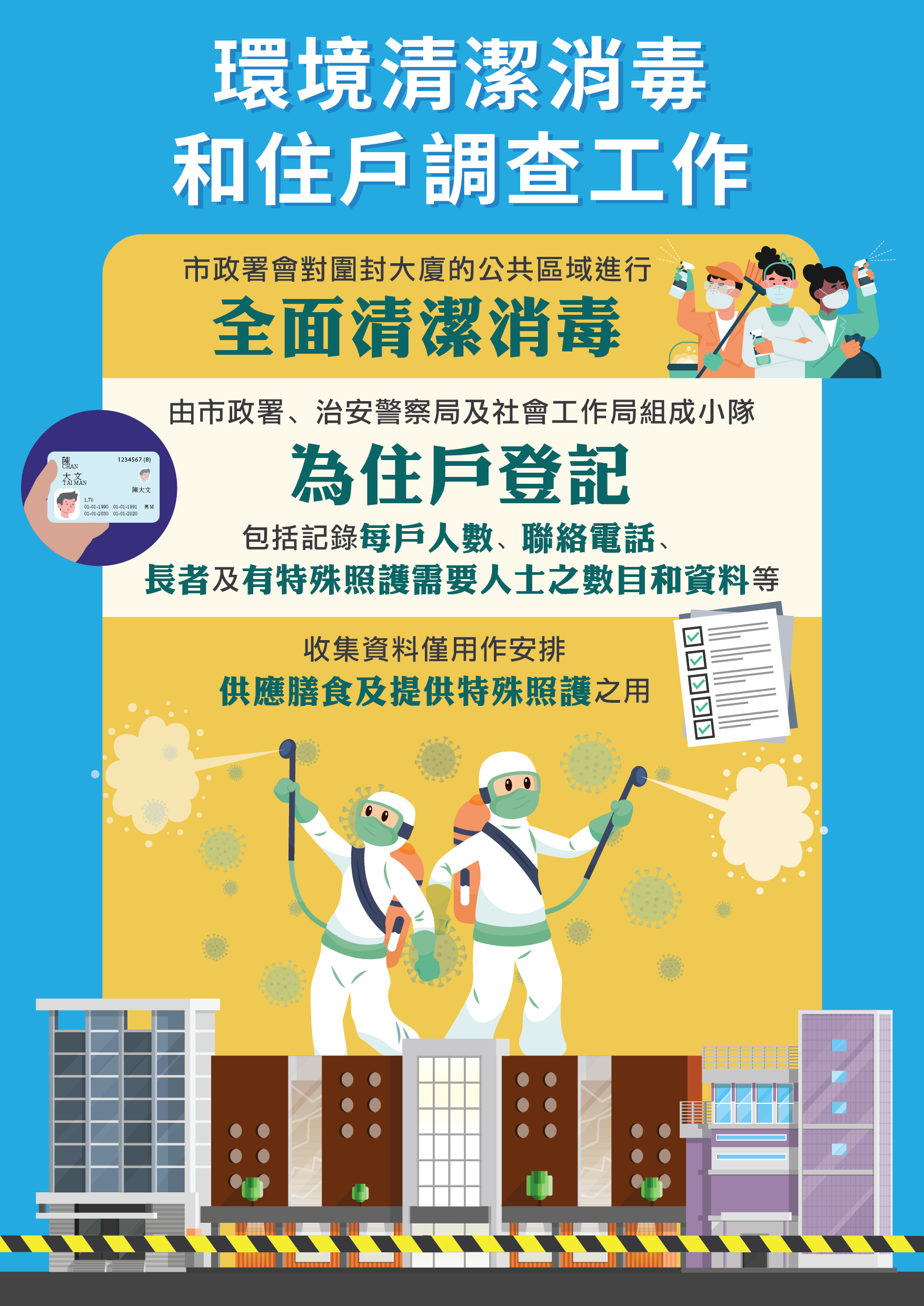 穿著防護裝備的工作人員記錄每戶人數、聯絡電話、長者及特殊需要人士數目等資料,同時向住戶派發介紹圍封期間各措施安排、緊急聯繫電話的宣傳單張。為使登記工作更流暢,呼籲住戶及早備妥健康碼及登記所需資料,而是次收集所得資料僅用作安排居民接受病毒核酸篩查及供餐。