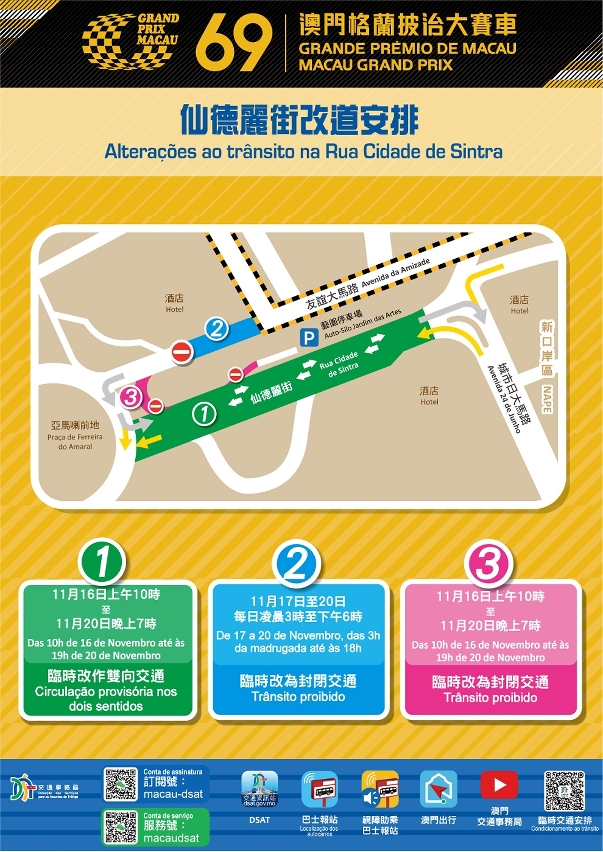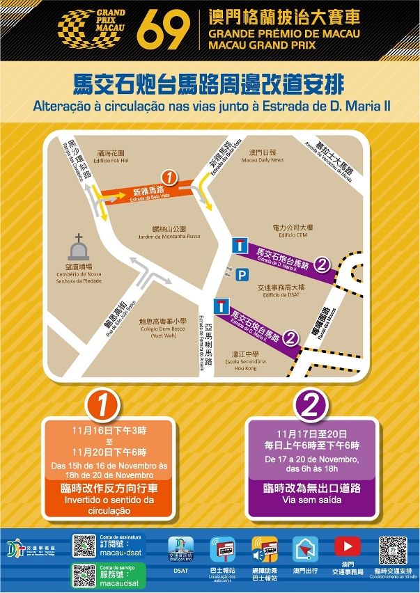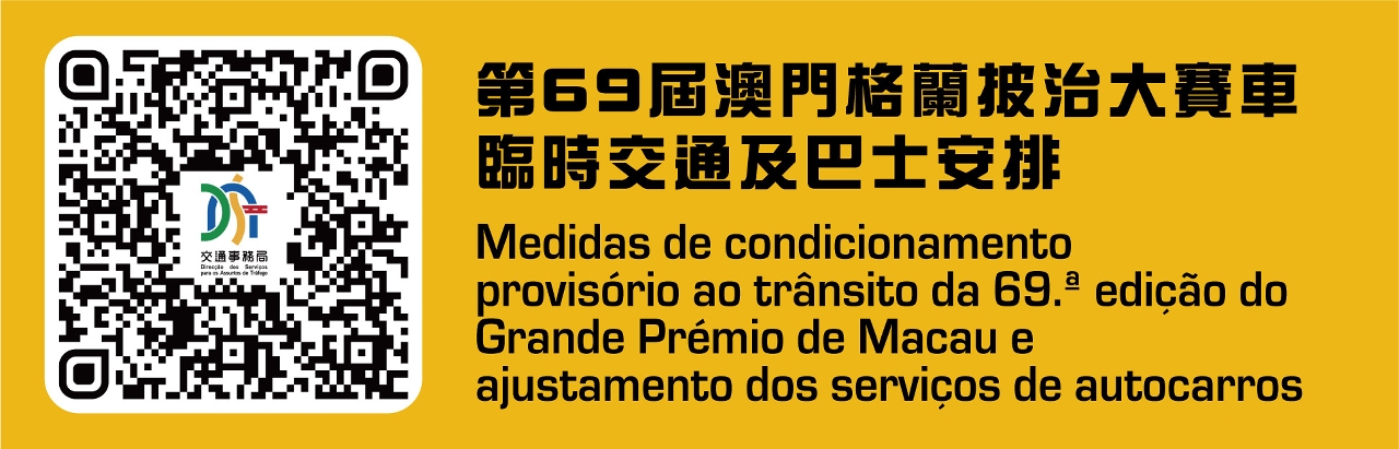 配合第69屆澳門格蘭披治大賽車舉行,11月16日(周三)至20日(周日)賽道及周邊路段實施多項臨時交通管制措施。11月17日(周四)至20日(周日),50條巴士路線改道,H2路線停運,12T及31T免費穿梭巴士路線分別往返外港碼頭至亞馬喇前地及綜藝館(請見附表一和二)。具體臨時交通和巴士調整安排,可掃描二維碼瀏覽本局相關網頁。