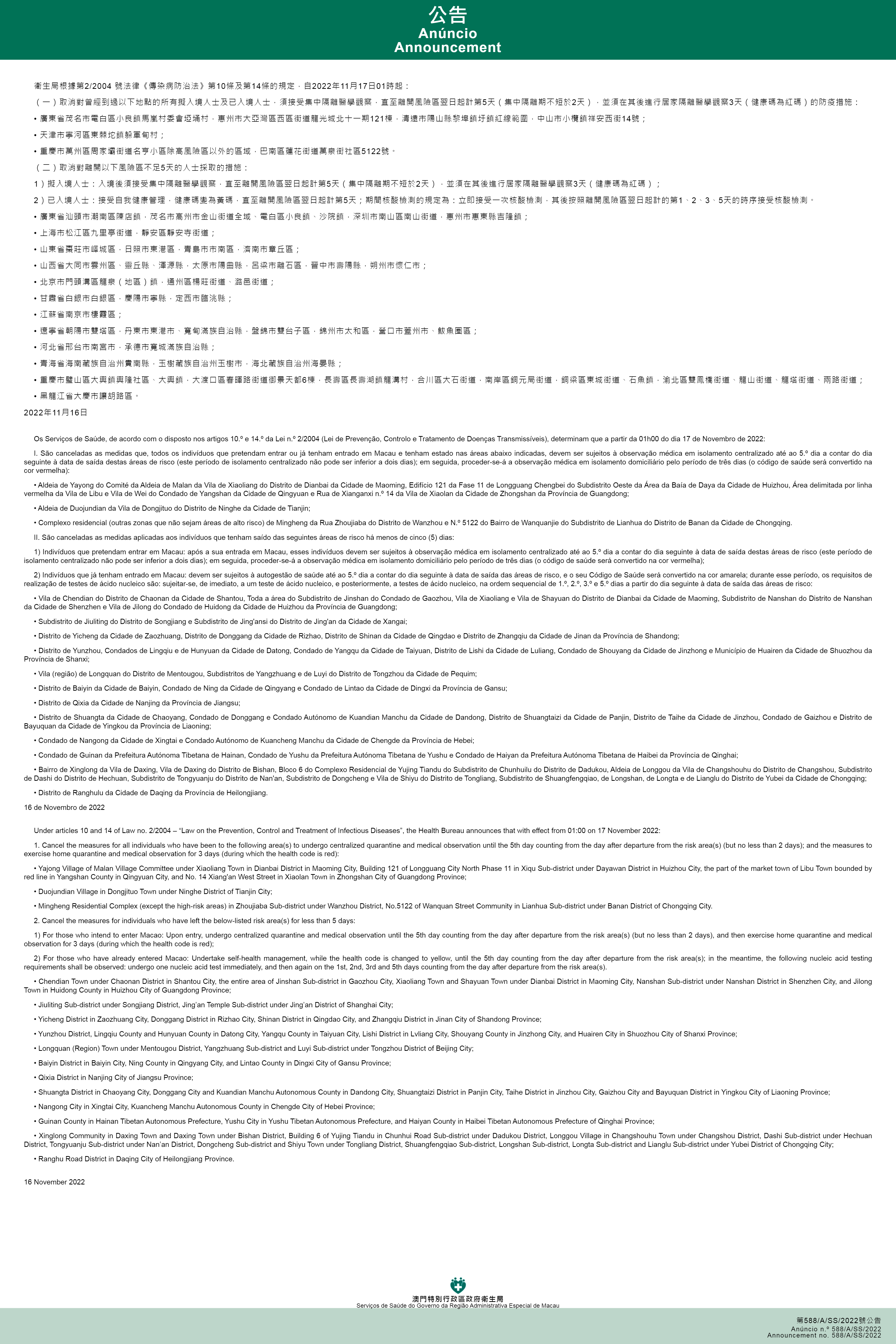 新型冠狀病毒感染應變協調中心(下稱應變協調中心)宣佈,因應內地的疫情變化,衛生局根據第2/2004號法律《傳染病防治法》第10條和第14條的規定,自2022年11月17日凌晨1時起,新增或取消對曾到內地相關區域人士的防疫措施: