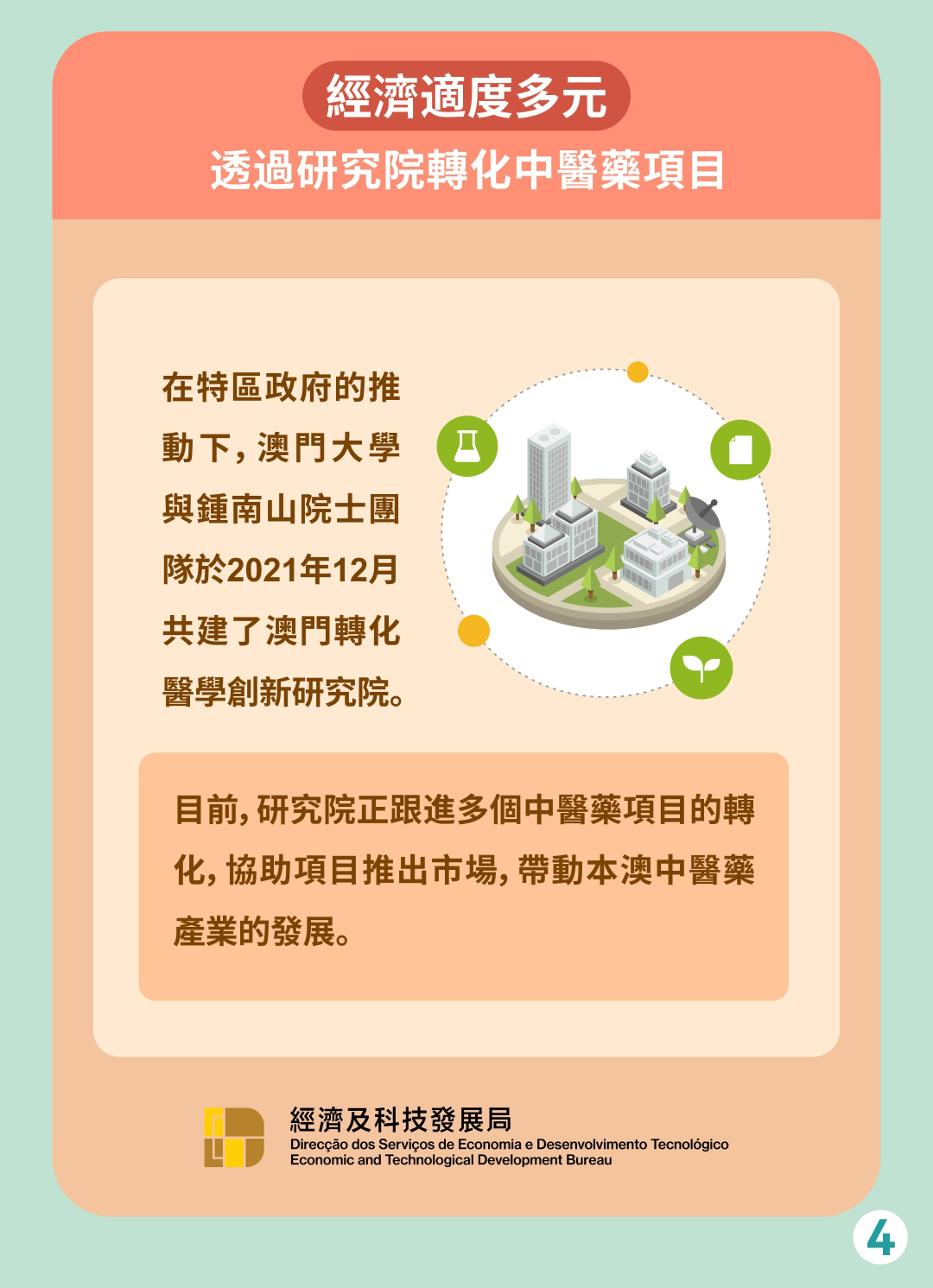 特區政府以中醫藥研發製造為切入點,培育發展大健康產業,粵澳合作中醫藥科技產業園和經濟科技發展局積極推進產業發展,特別為本澳中醫藥製造產業提供相應的支持,以促進本澳經濟適度多元化發展。