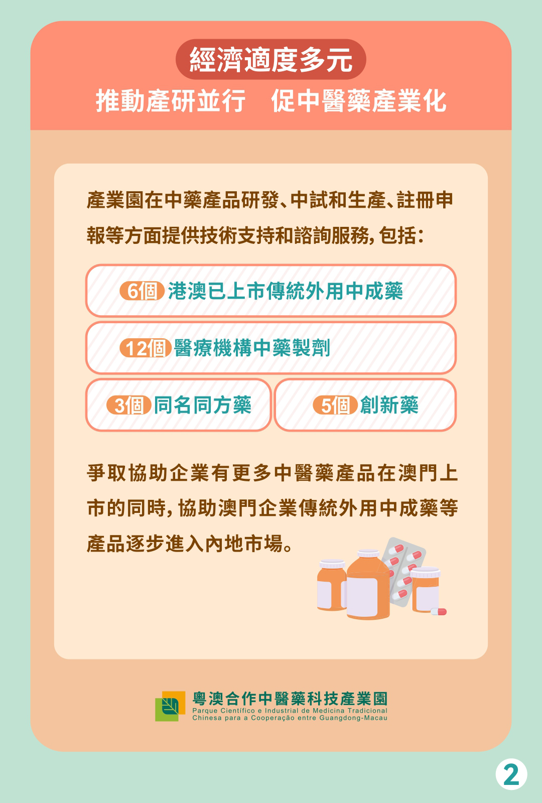 產業園推動產研並行,配合澳門《中藥藥事活動及中成藥註冊法》的實施,發揮產業園平台功能和服務優勢,依託“粵港澳中醫藥政策與技術研究中心”、“粵澳醫療機構中藥製劑中心”等平台,藉助粵港澳大灣區和橫琴粵澳深度合作區的政策優勢,重點在中藥產品研發、中試和生產、註冊申報等方面提供技術支持和諮詢服務,包括6個港澳已上市傳統外用中成藥、12個醫療機構中藥製劑、3個同名同方藥、5個創新藥等,爭取協助企業更多中醫藥產品在澳門上市的同時,協助澳門企業傳統外用中成藥等產品逐步進入內地市場。