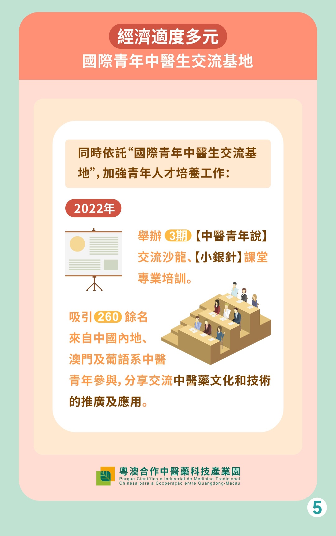產業園持續運用“以醫帶藥”模式推動中醫藥國際化,發揮中葡平台的作用,以國家中醫藥服務出口基地為載體,開展以葡語系國家為切入點的中醫藥產品國際註冊和貿易,並依託“國際青年中醫生交流基地”加強青年人才培養工作。以及協助多家企業分別在莫桑比克、巴西等地區,為十多款中成藥產品取得註冊批文。