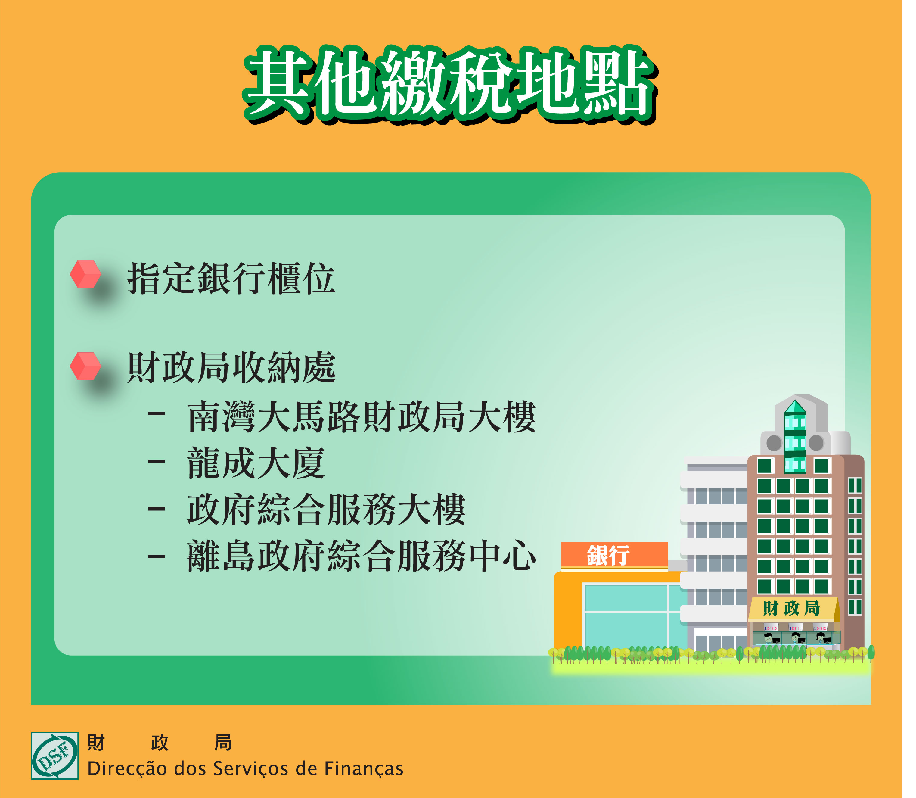 | 財政局大樓及龍成大廈 | 星期一至四(9:00-18:00) 星期五(9:00-17:45) |