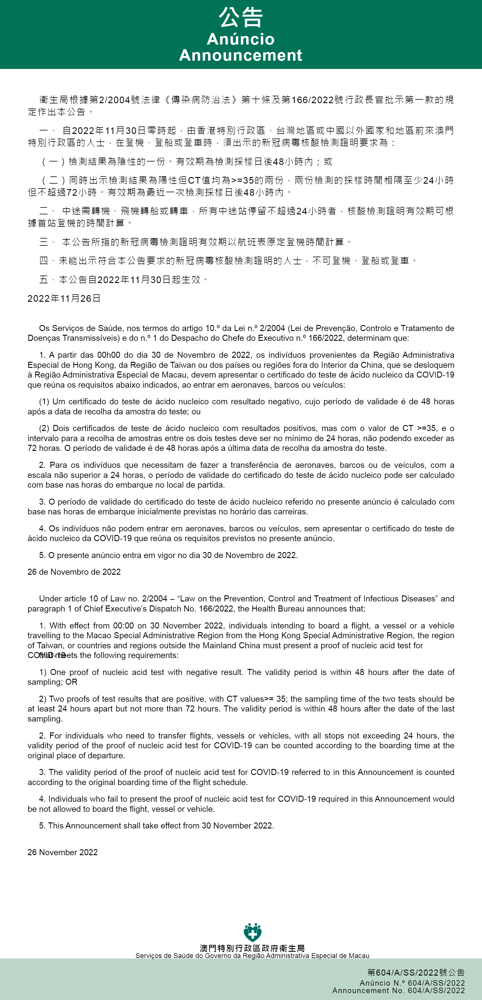 新型冠狀病毒感染應變協調中心(下稱應變協調中心)公佈,衛生局根據第2/2004號法律《傳染病防治法》第10條及第166/2022號行政長官批示第一款的規定作出第604/A/SS/2022公告,自2022年11月30日零時起,由香港特別行政區、台灣地區或中國以外國家和地區前來澳門特別行政區的人士,在登機、登船或登車時,須出示符合以下要求的新冠病毒核酸檢測證明,而未能出示的人士,不可登機、登船或登車:
