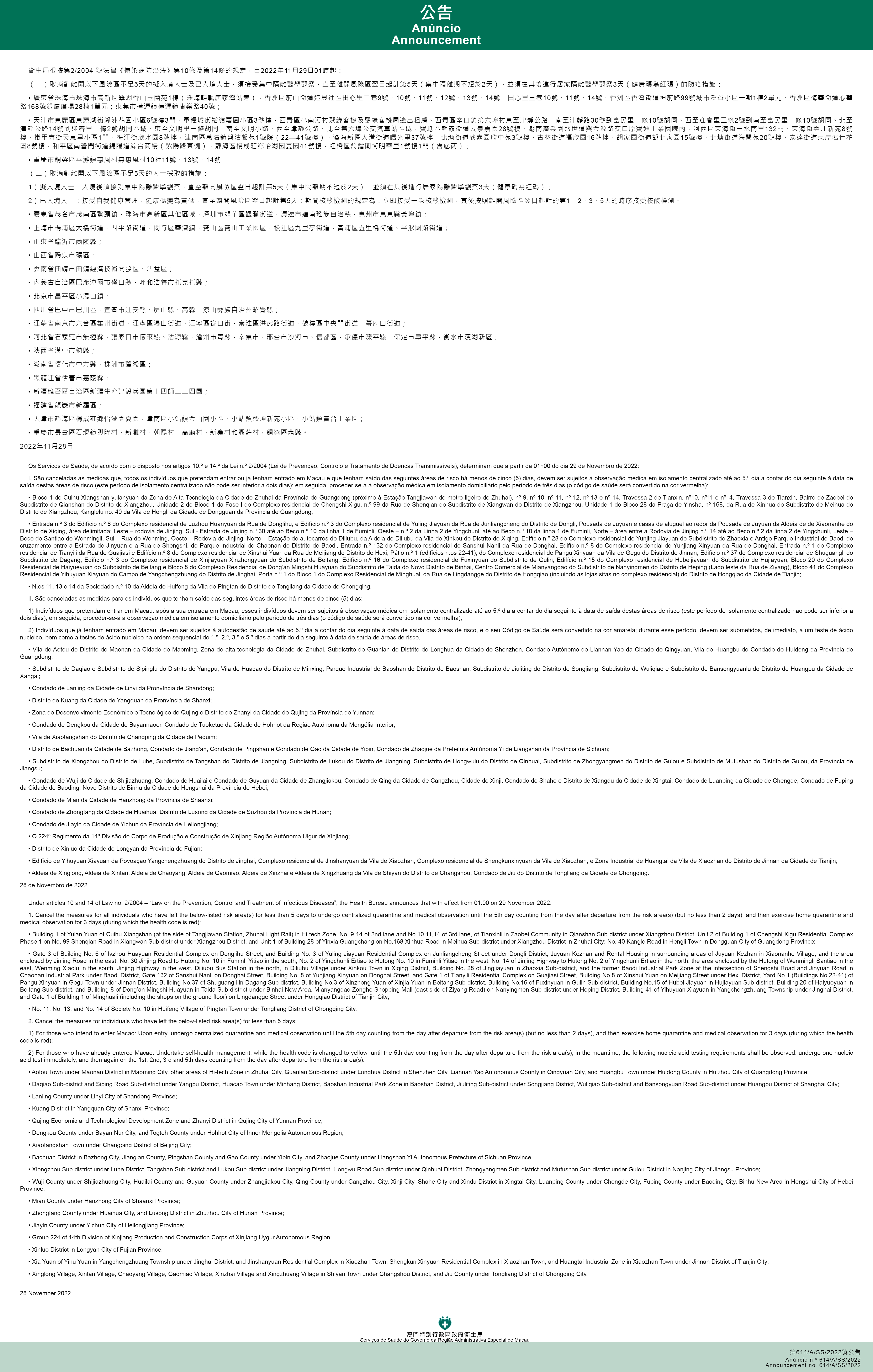 新型冠狀病毒感染應變協調中心(下稱應變協調中心)宣佈,因應內地的疫情變化,衛生局根據第2/2004號法律《傳染病防治法》第10條和第14條的規定,自2022年11月29日凌晨1時起,新增或取消對曾到內地相關區域人士的防疫措施: