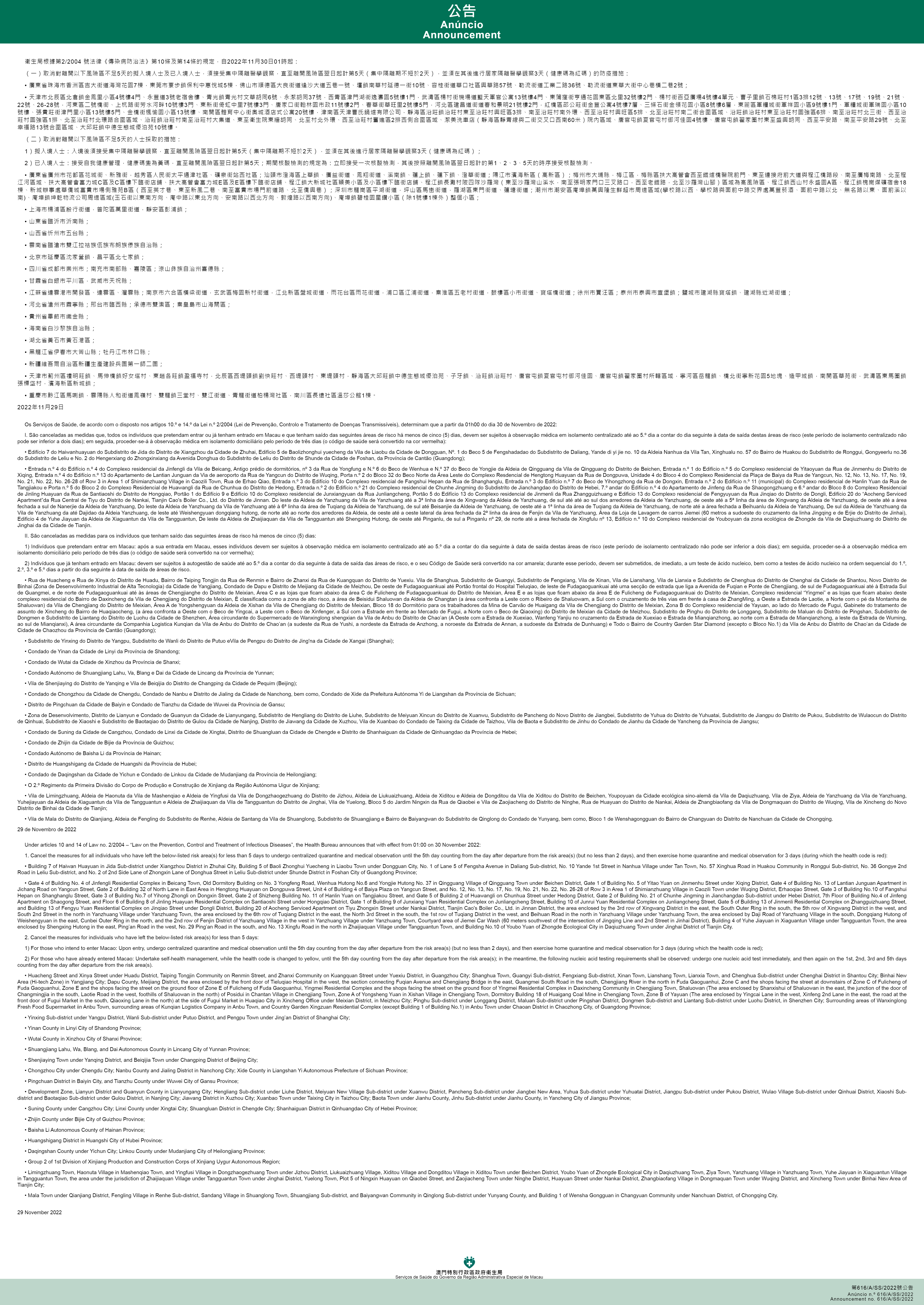 新型冠狀病毒感染應變協調中心(下稱應變協調中心)宣佈,因應內地的疫情變化,衛生局根據第2/2004號法律《傳染病防治法》第10條和第14條的規定,自2022年11月30日凌晨1時起,新增或取消對曾到內地相關區域人士的防疫措施: