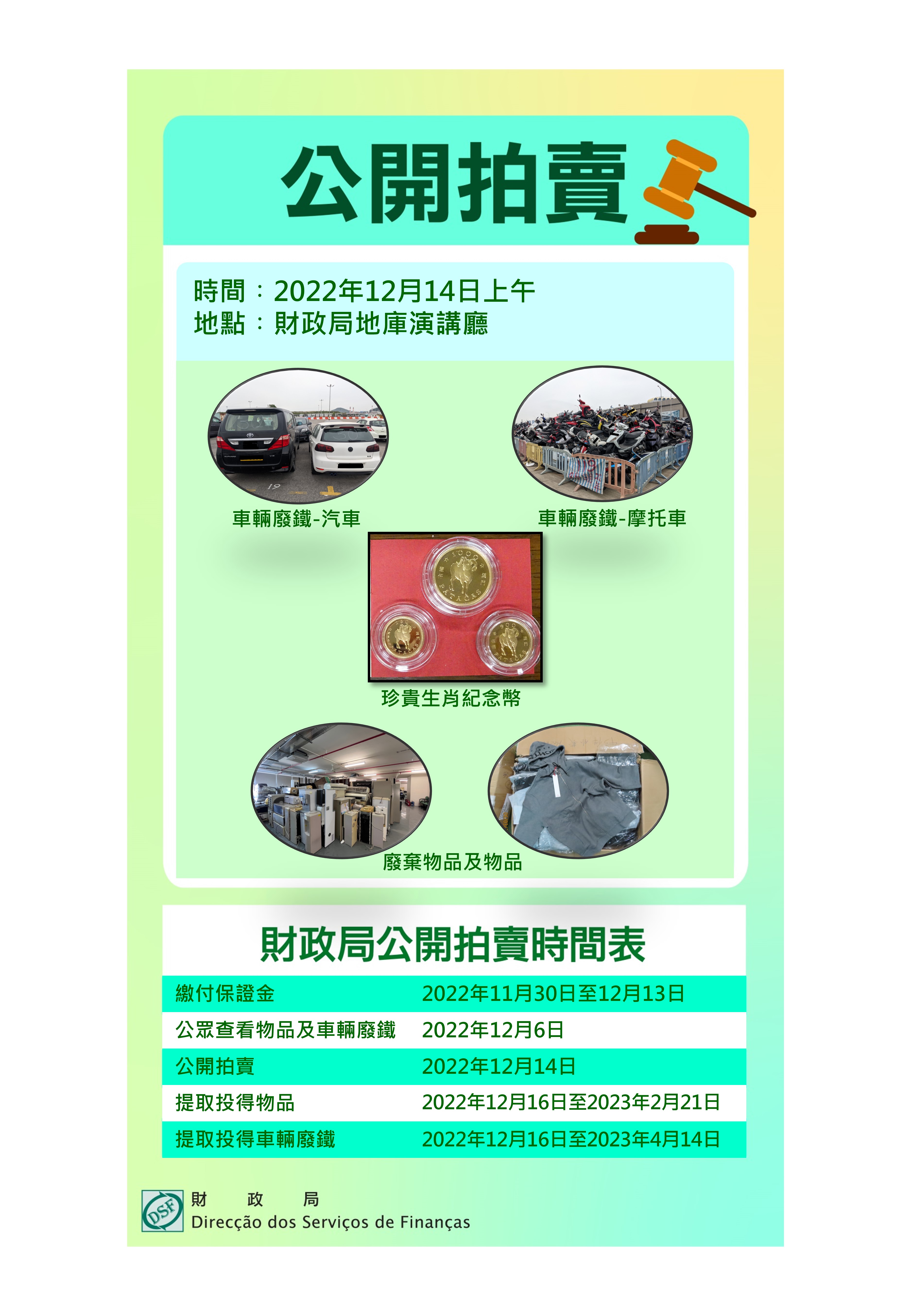 財政局將於12月14日(星期三)上午10時於財政局地庫演講廳舉行公開拍賣撥給特區所有的物品,當中包括:衣物及珍貴生肖紀念幣;以及一些屬特區所有但已報廢的車輛廢鐵、廢棄物品及物品等。