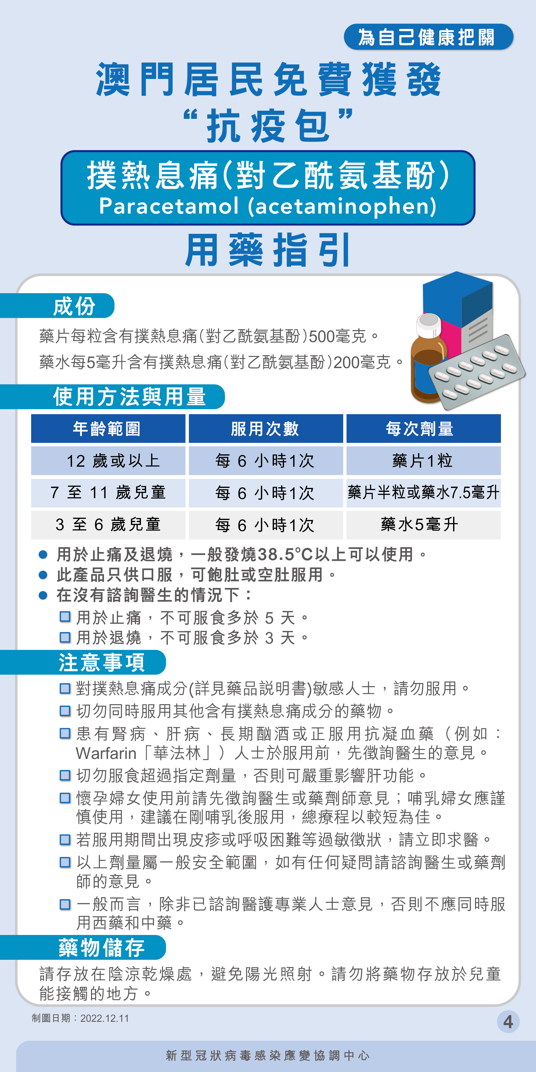 為應對本澳內外疫情變化,新型冠狀病毒感染應變協調中心(下稱應變協調中心)向全澳居民免費派發“抗疫包”,以備不時之需,並按不同年齡層的實際需求和適用範圍分四個種類。