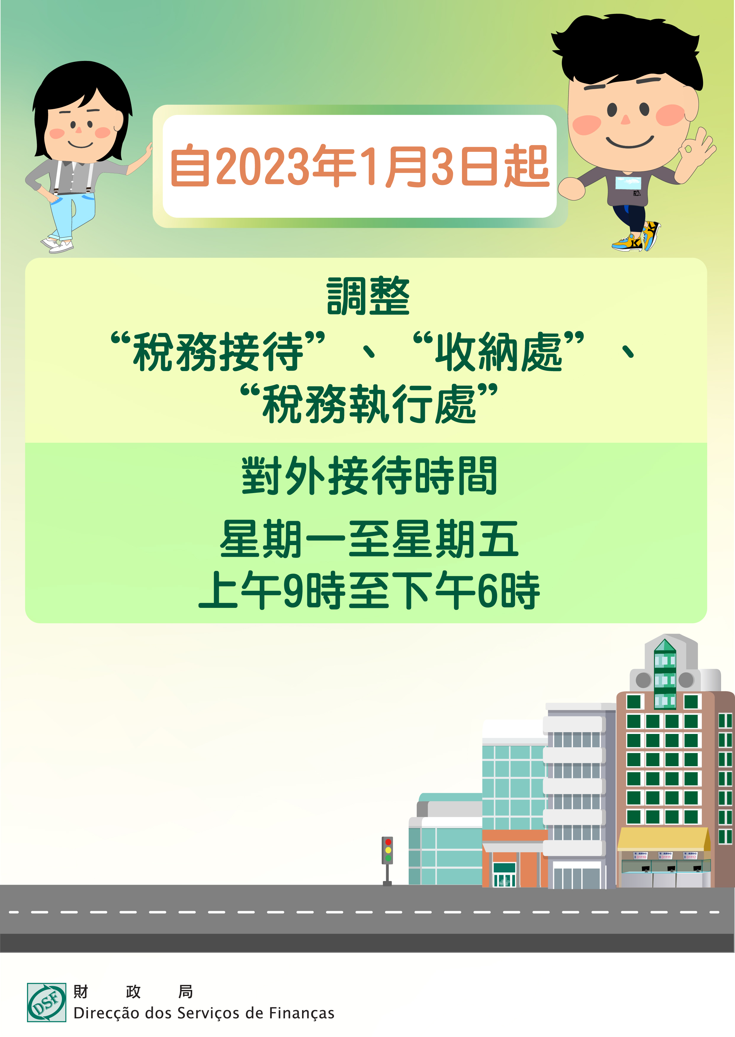 自2023年1月3日起,南灣財政局大樓、龍成稅務執行處,以及收納處之對外接待時間將統一與財政局其他兩個辦公地點(黑沙環政府綜合服務大樓及離島政府綜合服務中心之稅務接待)的接待時間相同,為星期一至五上午9時至下午6時,敬請公眾留意。