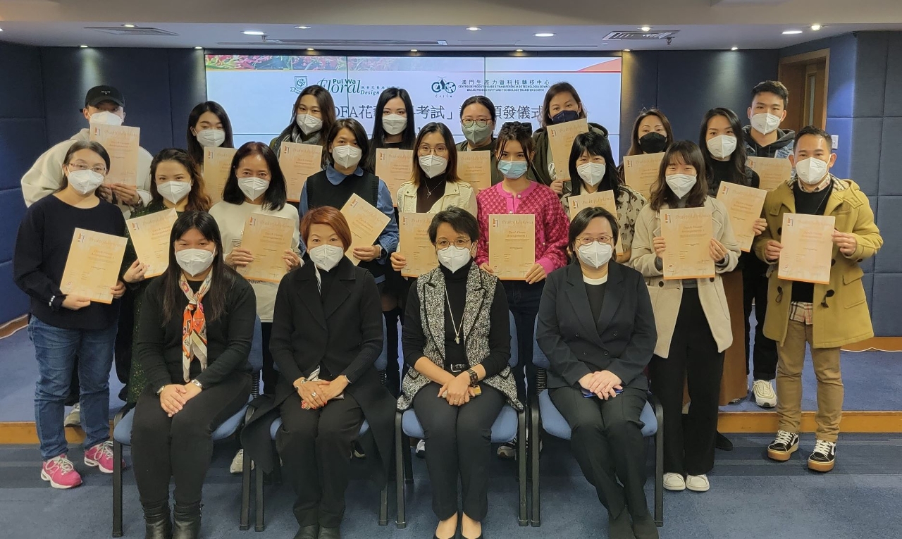 「荷蘭DFA花藝專科考試」日前舉行頒發證書儀式,在澳門生產力暨科技轉移中心總辦事處舉行,32位考生通過考核,獲頒證書。