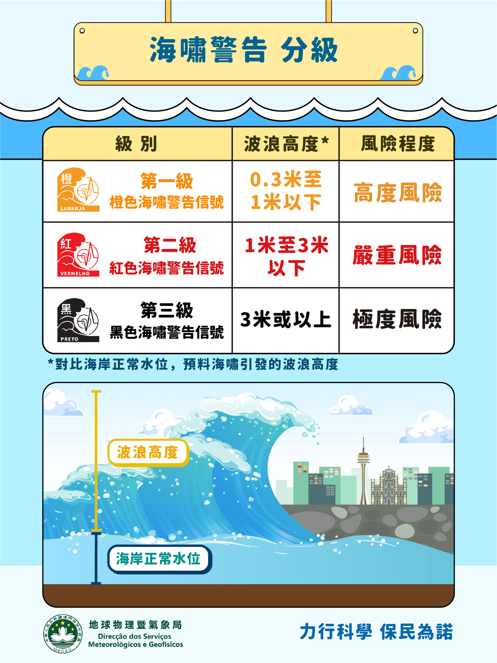 海嘯警告信號按影響本澳的海嘯波高(比正常水位高出的幅度)分為橙色、紅色及黑色三個級別,以反映海嘯對澳門海域影響的風險程度。