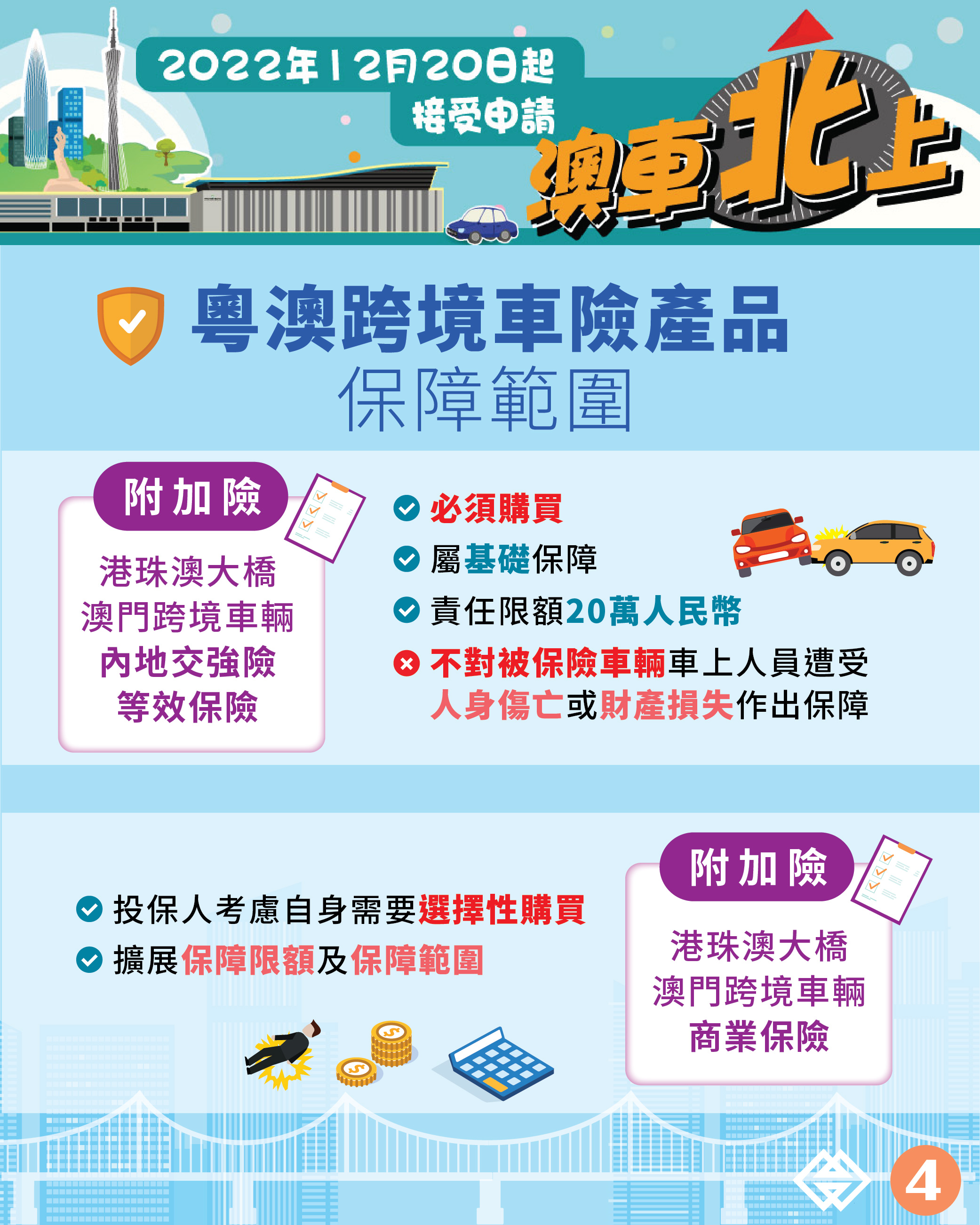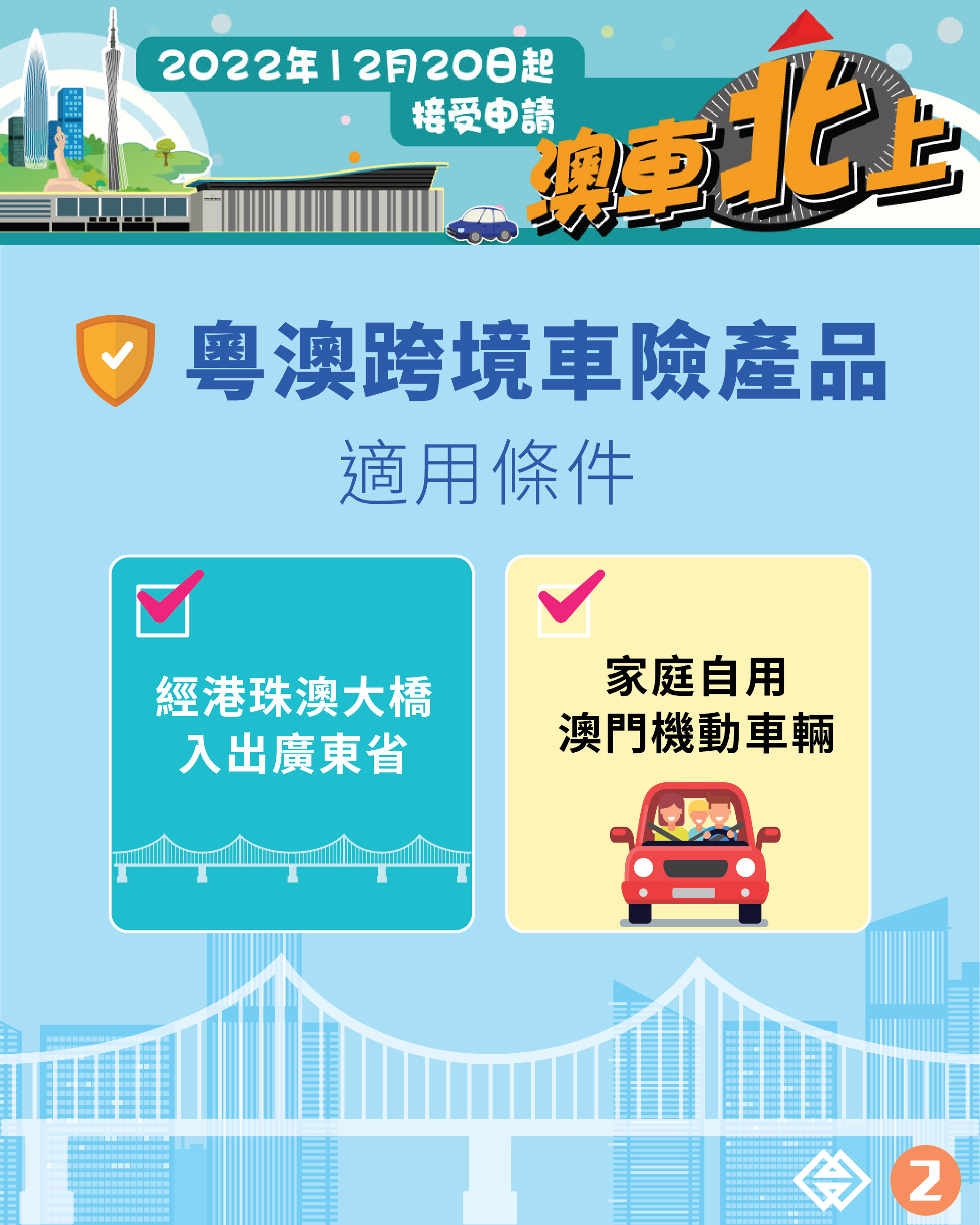 粵澳跨境車險產品是澳門汽車民事責任強制保險合同的附加保險,適用於經港珠澳大橋珠海公路口岸,入出廣東省行駛的特定澳門機動車輛,車主可向其購買汽車民事責任保險、且已獲許經營“澳車北上”產品的保險公司瞭解詳情及投保。