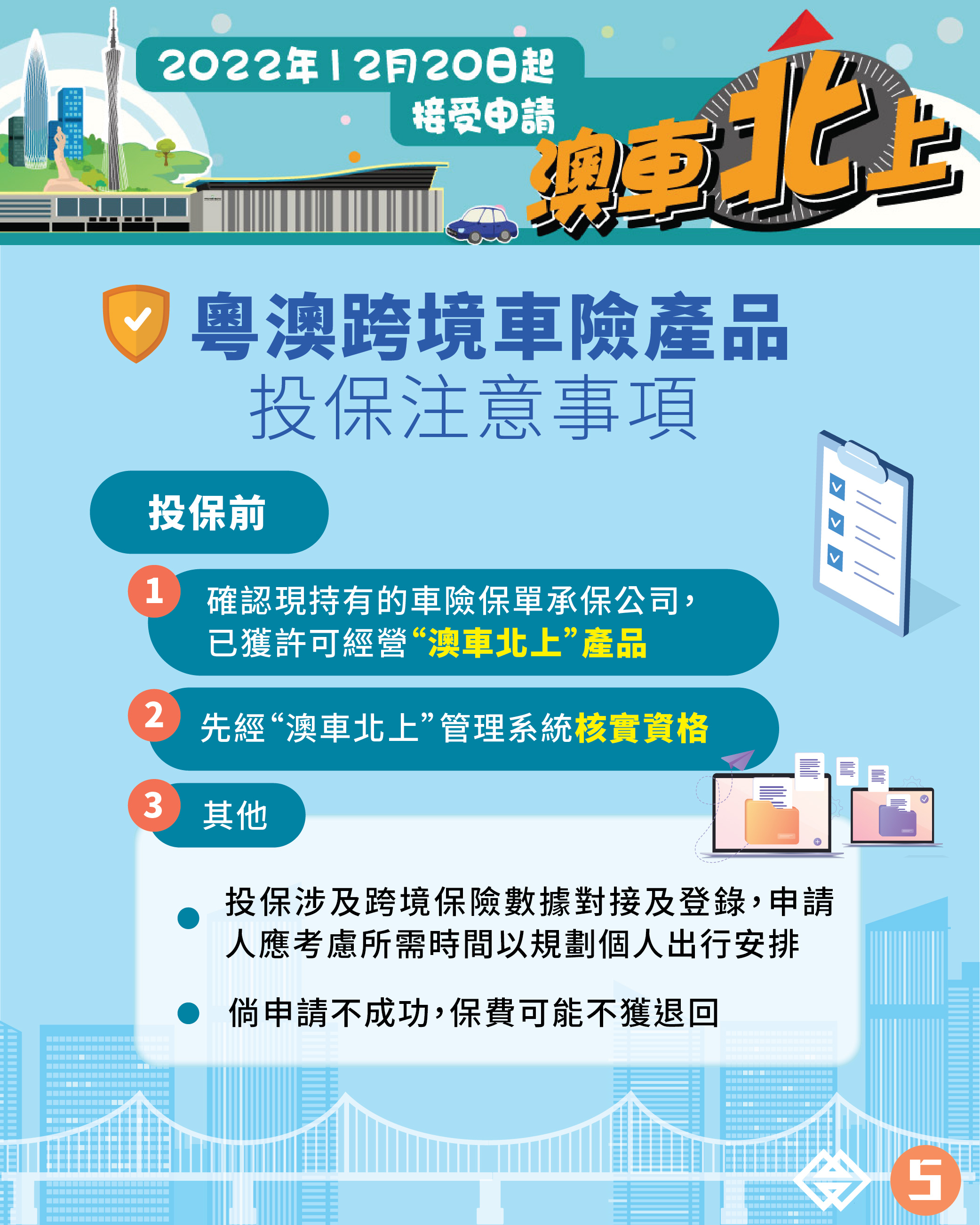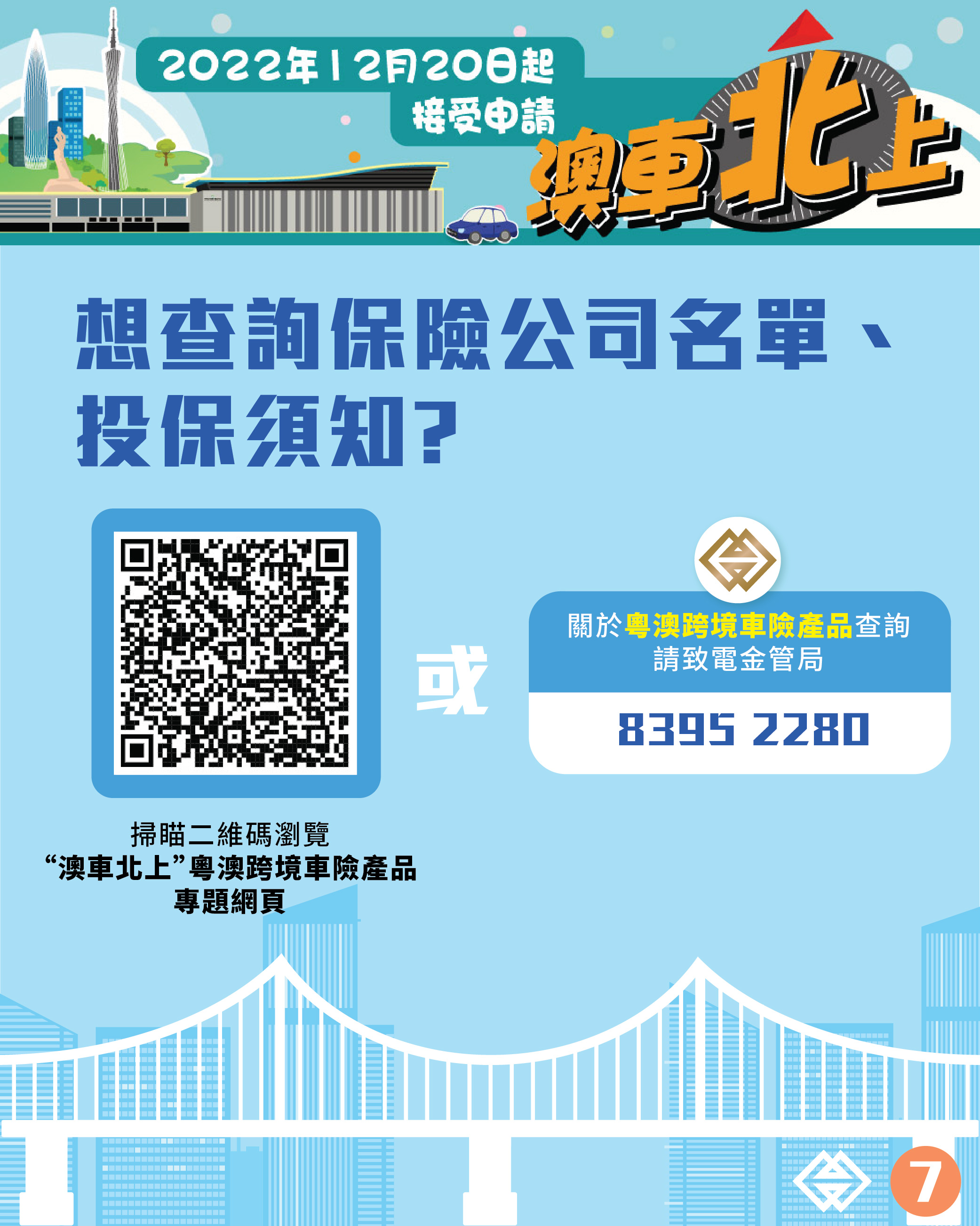 金管局已開通“澳車北上粵澳跨境車險產品專題網頁”(https://www.amcm.gov.mo/zh-hant/insurance-sector/crossbordervehicle ),列出參與提供“澳車北上”產品的澳門保險公司及聯絡資訊,同時載有投保須知、問題集及圖文包,方便市民瞭解詳情。