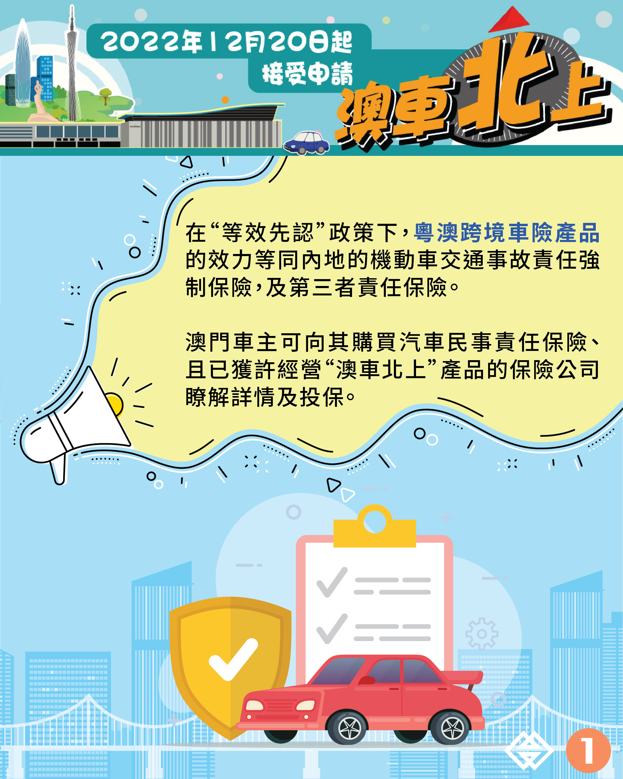 配合“澳車北上”的實施,澳門金融管理局已協調澳門保險公司推出“粵澳跨境車險產品”。在“等效先認”政策下,粵澳跨境車險產品的效力等同內地的機動車交通事故責任強制保險,及第三者責任保險。澳門車主可向其購買汽車民事責任保險、且已獲許經營“澳車北上”產品的保險公司瞭解詳情及投保。