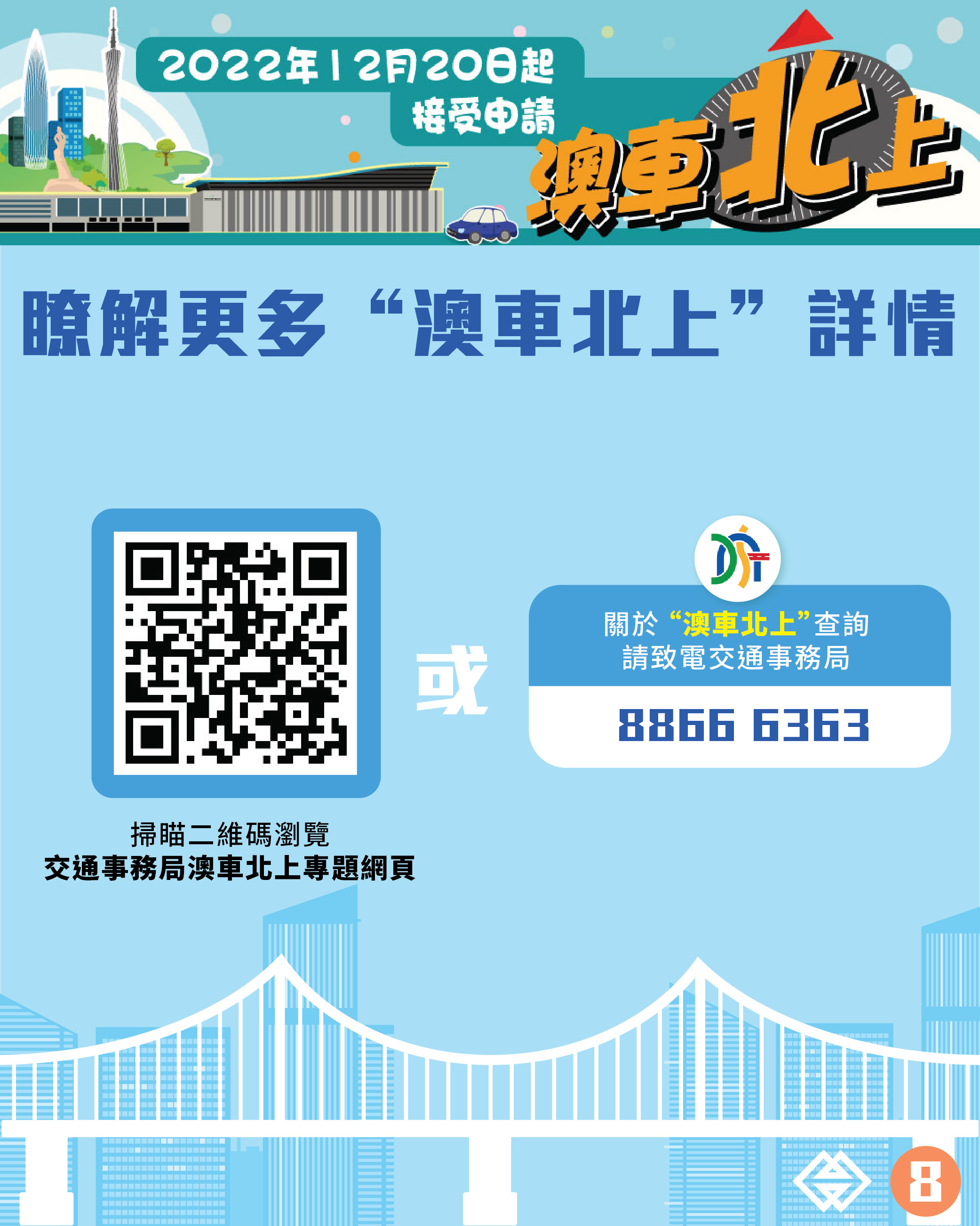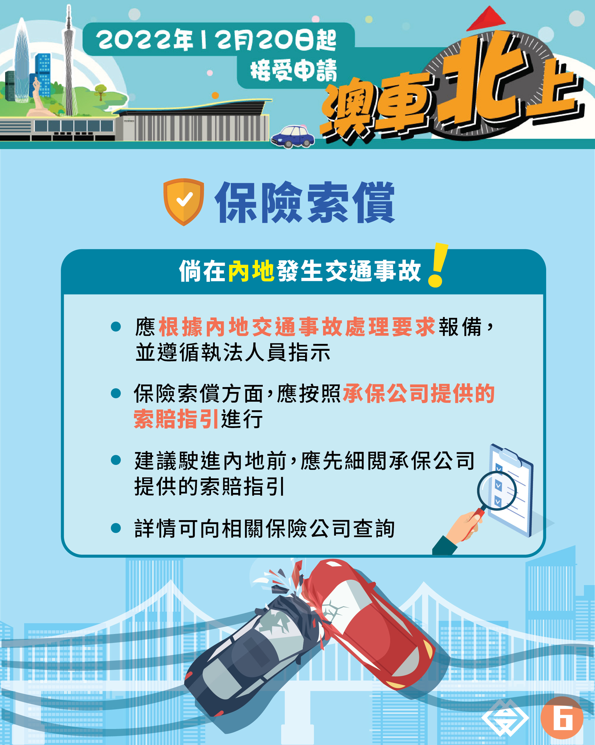 車主透過“澳車北上”信息管理服務系統作出申請的過程中,將收到短訊、電郵及系統通知,提醒上載粵澳跨境車險資料,以繼續申請流程。申請資格及手續詳情,可瀏覽交通事務局澳車北上專題網頁(https://www.dsat.gov.mo/mcars-to-gd)。