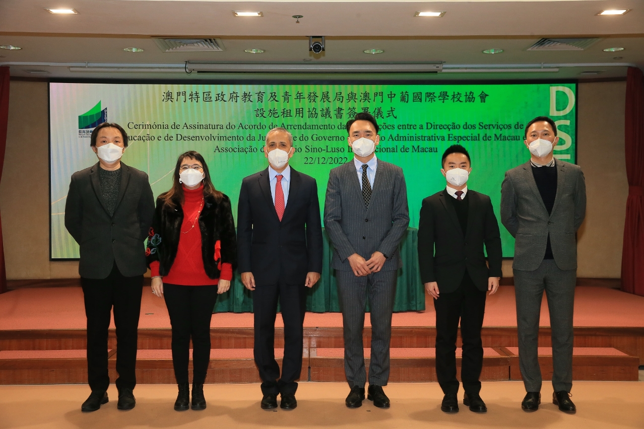 根據第100/2022 號社會文化司司長批示授予之權力, 2022年12月22日,澳門中葡國際學校協會設施租用協議書的簽署儀式在教育及青年發展局舉行,由教青局局長龔志明代表特區政府與澳門中葡國際學校協會代表歐安利簽署相關協議。