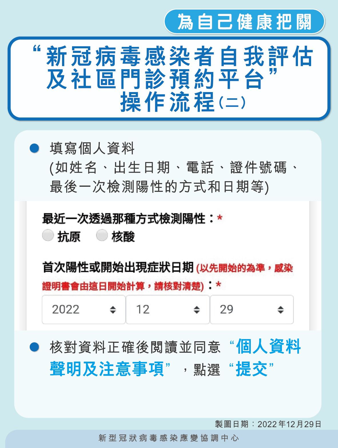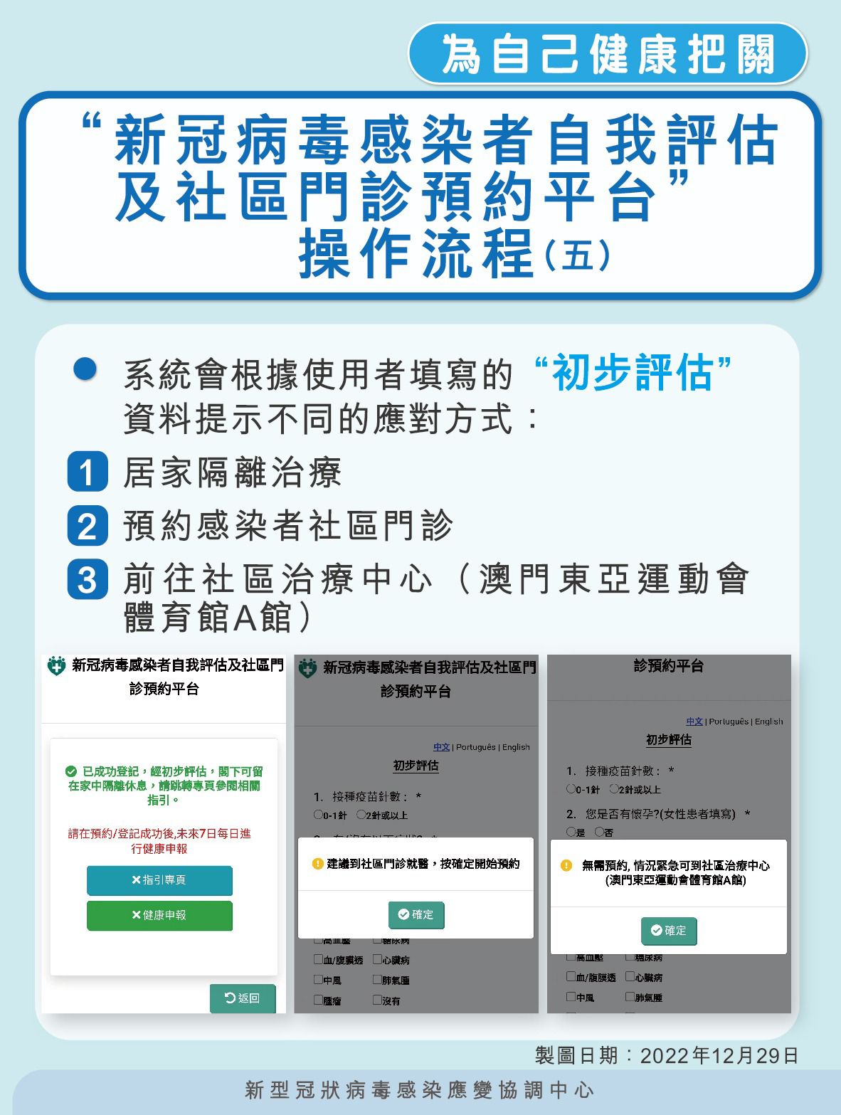 1. 核酸檢測或快速抗原檢測呈陽性的居民通過自我評估平台(https://eservice.ssm.gov.mo/covid19positivebook)進行自我評估;