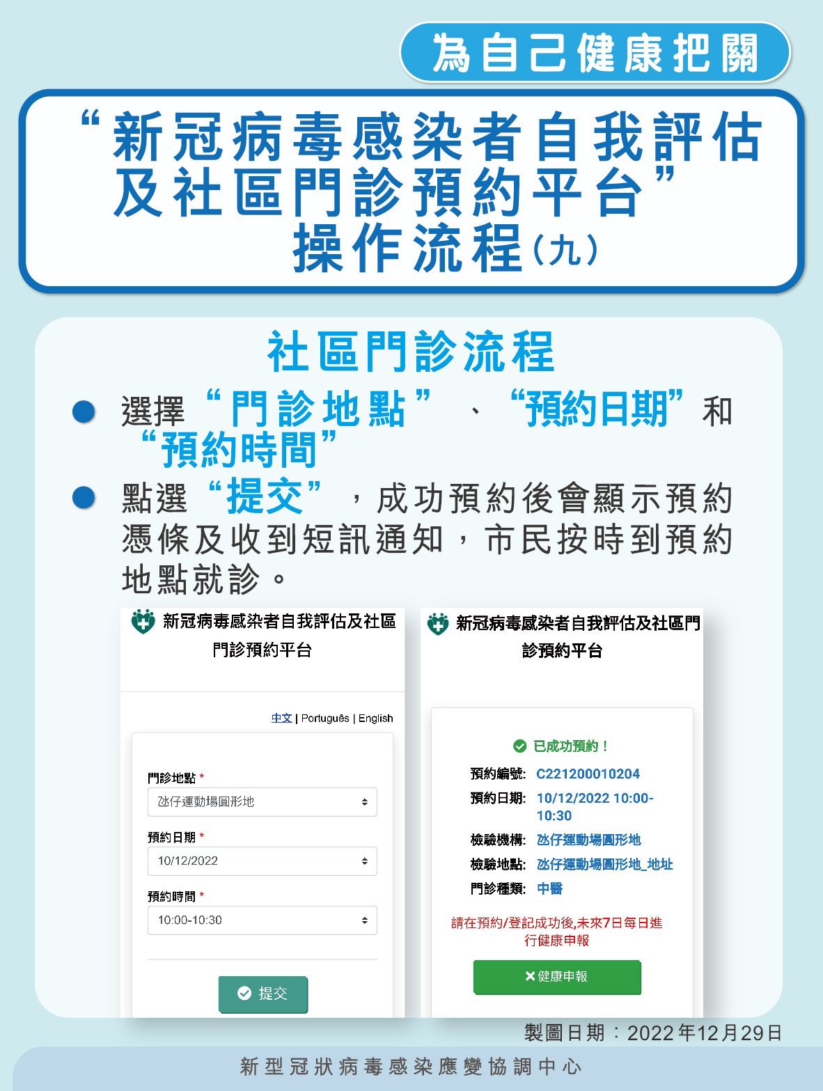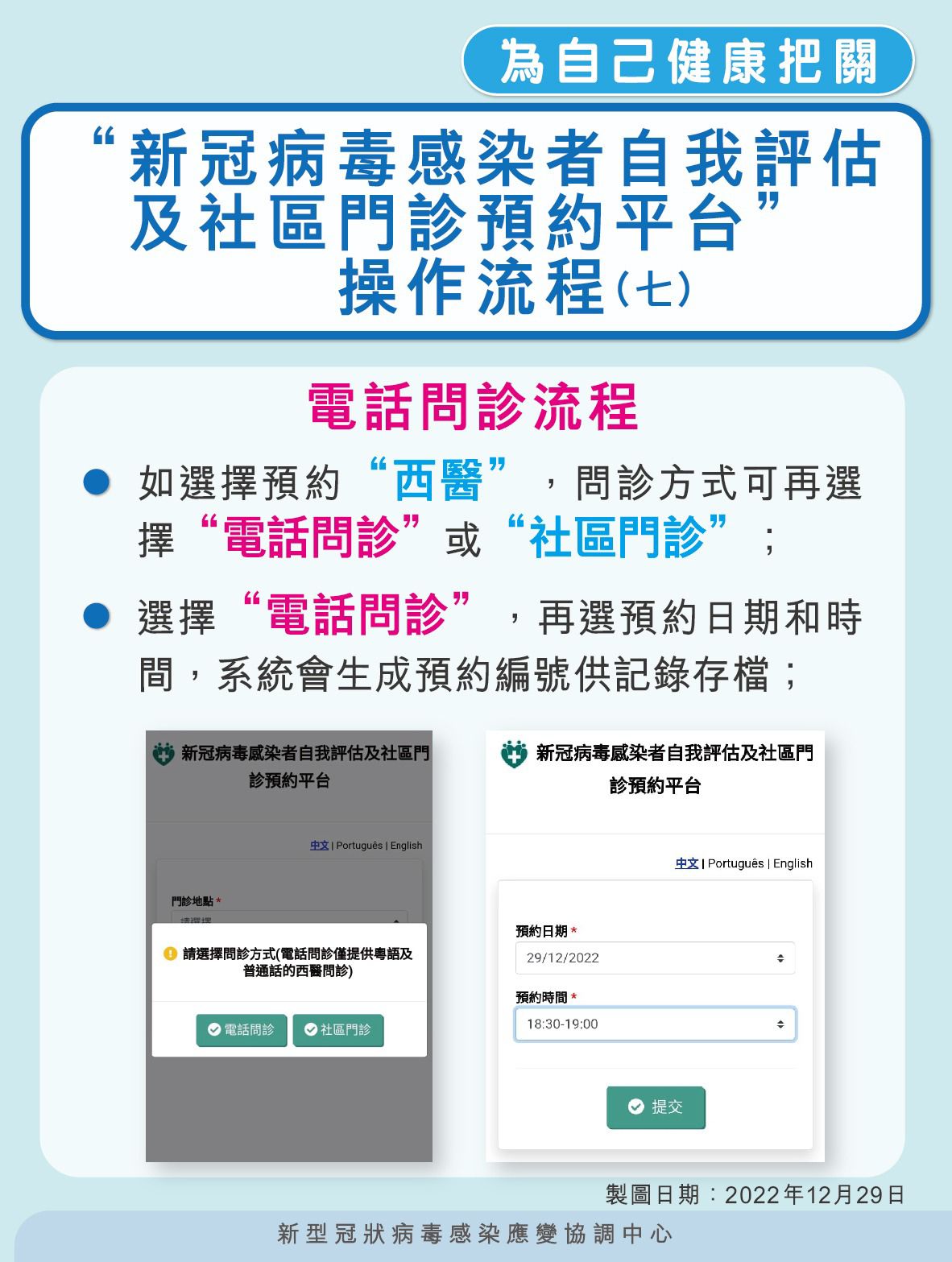 為進一步便利不同治療需要的輕症感染者在晚間到醫院求診的需求,應變協調中心將於明日(12月31日)起,將優化社區門診的服務,於自我評估平台加設社區門診西醫電話問診選項服務,電話問診時間為︰早上10時至晚上9時,流程如下(具體可參閱附件【圖文包】):