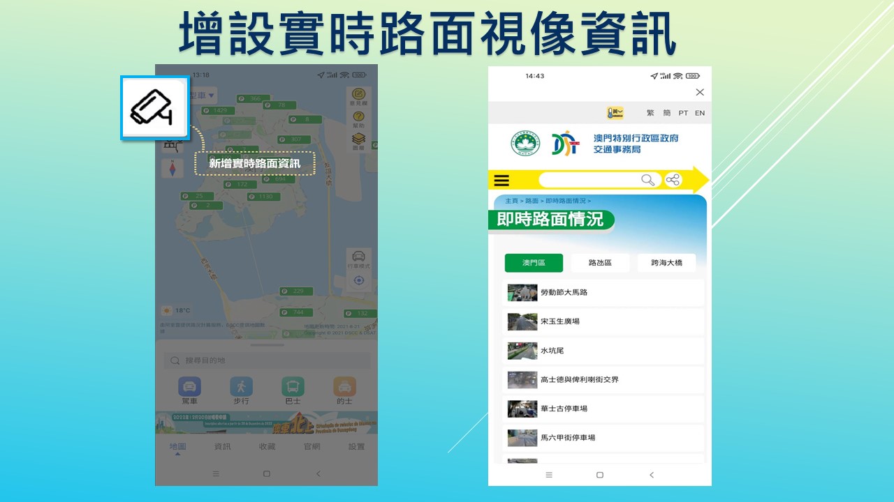 為繼續推動智慧交通之發展,交通事務局持續優化澳門出行APP,新版增設路面及口岸視像資訊,讓市民以視像方式瞭解路面及口岸情況,以更好地規劃行程,相關APP的更新版已上載到iOS及Google應用商店,歡迎市民免費下載使用。