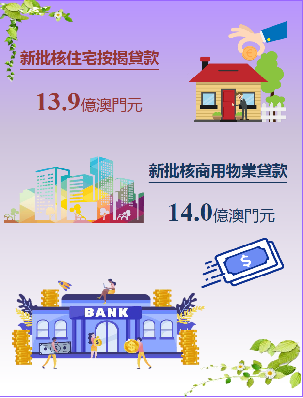 未償還商用物業貸款總額達1,650.3億澳門元,按月上升0.5%,與一年前比較增加3.4%;其中,居民部分佔93.6%。與一個月前比較,居民及非居民部分的未償還商用物業貸款分別上升0.5%及0.7%。