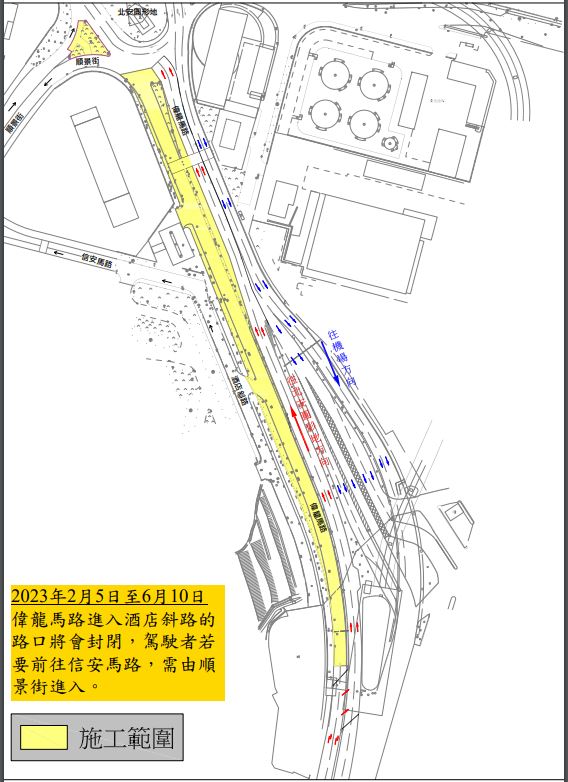 由2月5日至6月10日,偉龍馬路進入酒店斜路的路口將會封閉,駕駛者若要前往信安馬路,需由順景街進入(詳見附圖3)。