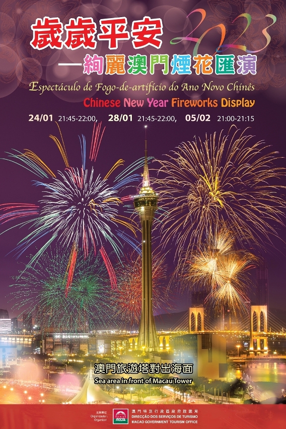 今年特別安排三場煙花表演,分別於年初三(1月24日)及年初七(1月28日)“人日”晚上9時45分在旅遊塔對出海面呈獻15分鐘煙花表演,共賀新歲;元宵佳節(2月5日)晚上9時將盛放第三場煙花表演,延續農曆新年的喜慶氣氛。